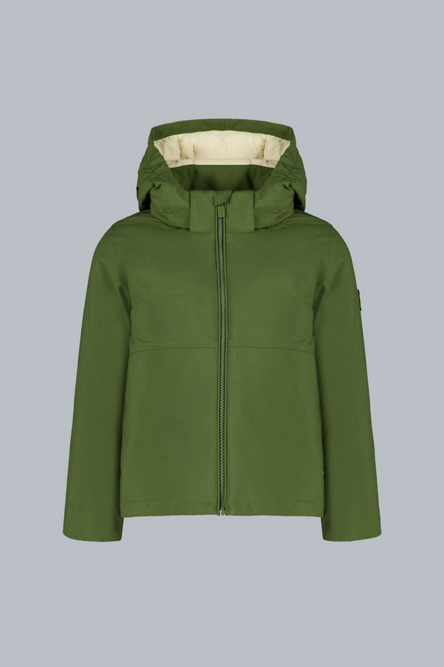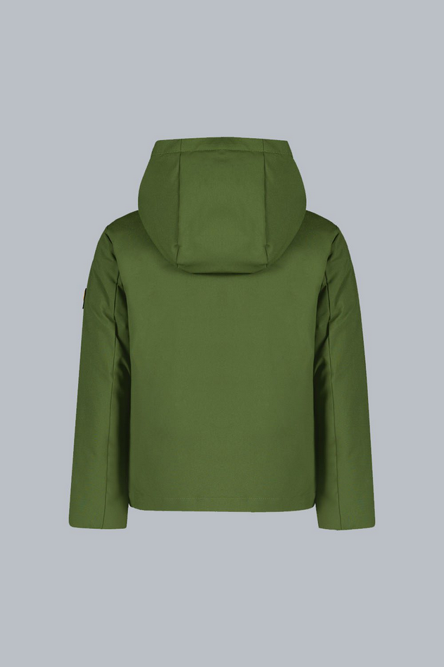 Giacca verde militare da bambino con cappuccio, realizzata in tessuto softshell mechanical stretch 2 layers con imbottitura ecologica. Dotata di zip a contrasto, è un capo idrorepellente e antivento (WP3K-MVP3K) che unisce performance tecniche, funzionalità e stile. Perfetta per completare look sportivi con un tocco pratico e contemporaneo. Codice prodotto 226CPBJ01587 P4A12P4637XP A25