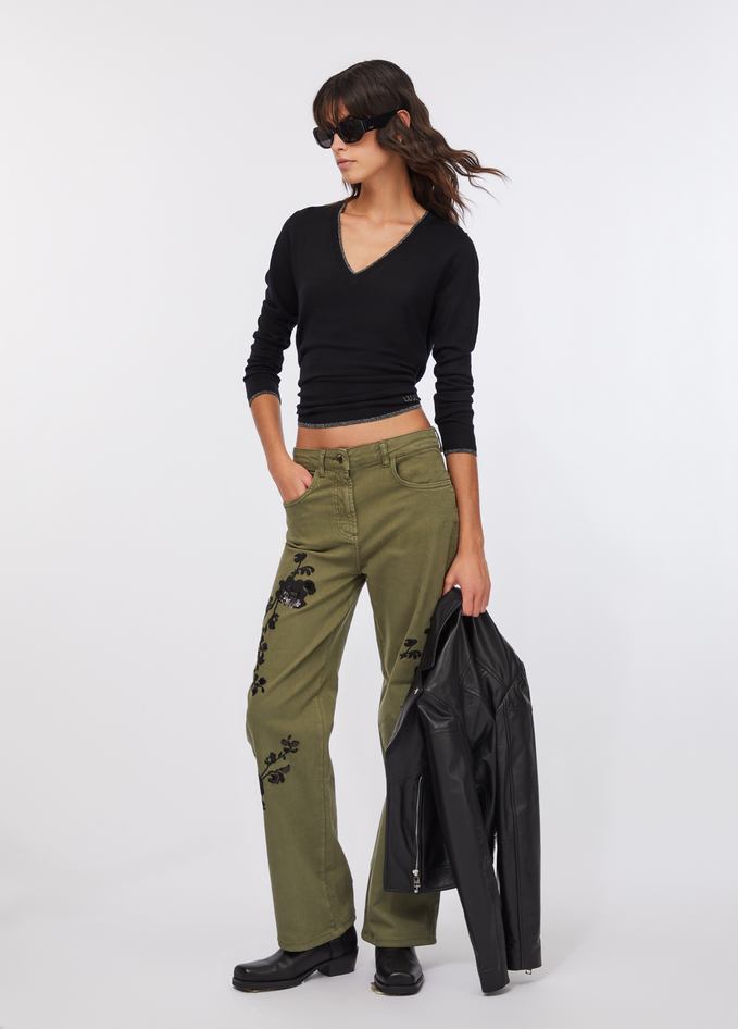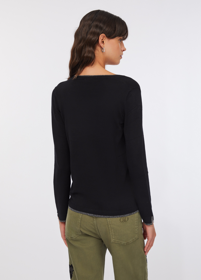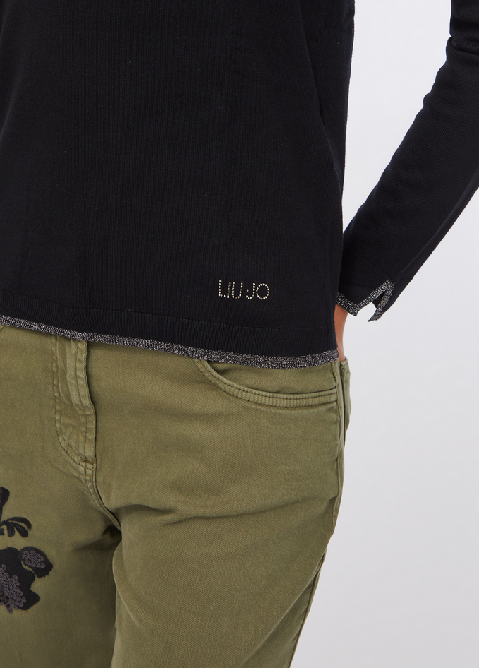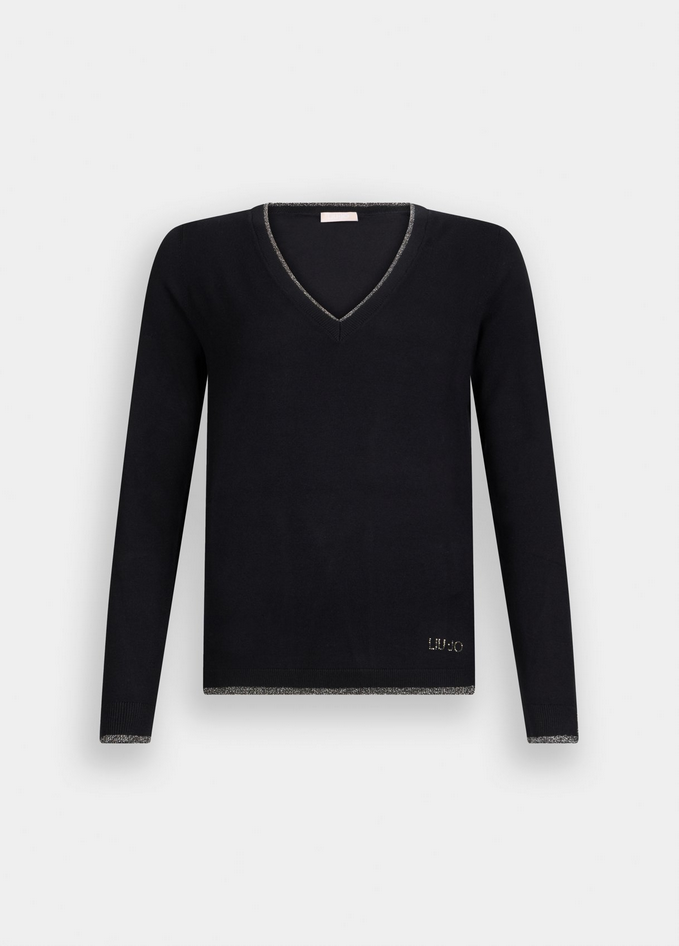 Maglia da donna in misto viscosa con scollo a V, interventi in lurex® e spacchetti sui polsi, prodotto "Liu Jo Better". Composizione: tessuto principale 80% viscosa, 20% poliammide, tessuto secondario 65% poliestere, 35% poliestere metallizzato. Lavare a mano, non trattare con cloro, non usare asciugatrice, stirare a temperatura massima 110 °C, non lavare a secco, asciugare in piano, non strofinare durante il lavaggio, lavare a rovescio, non lasciare a mollo i capi nell'acqua, non stirare le decorazioni, stirare interponendo un panno. Codice prodotto MF5227 MS49I22222 A25