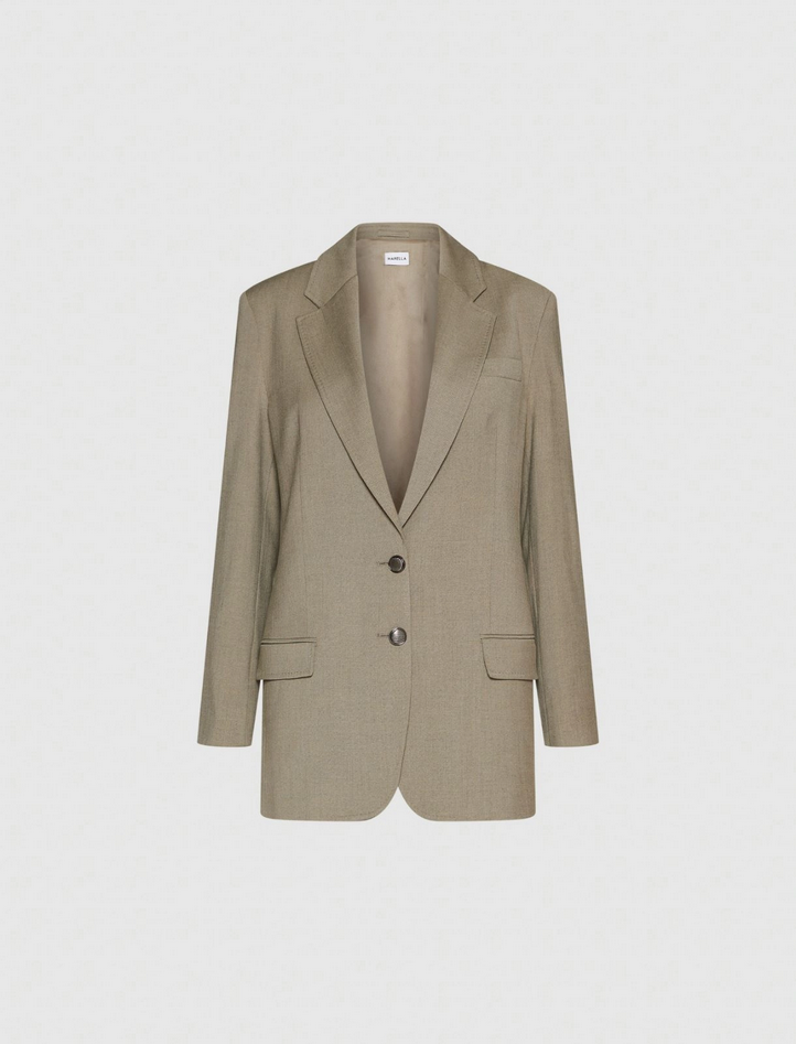 Blazer in saglia di misto lana mélange stretch con fodera interna, fit regolare, scollo con rever, chiusura monopetto con due bottoni, tasche laterali con patta e spacco posteriore, motivo di impunture a vista lungo i bordi. Composizione: tessuto 49% poliestere, 26% viscosa, 21% lana, 4% elastan; fodera fusto 64% acetato, 36% poliestere; fodera maniche 60% acetato, 40% viscosa. Lavaggio: non lavare in acqua, non candeggiare, non asciugare in tamburo, ferro tiepido max 120°C, lavare a secco delicato con percloroetilene, non lavare ad umido professionale. Codice prodotto ELEGIA 2523046101270001 A25