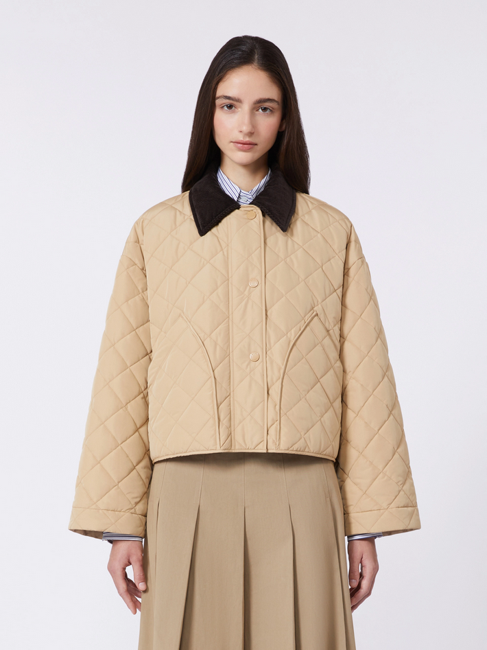 Giacca corta imbottita e reversibile dalla linea morbida, realizzata in tessuto antigoccia trapuntato a rombi con colletto a camicia in velluto a coste e maniche lunghe a giro basso. Presenta chiusura frontale con zip e bottoni a pressione, tasche applicate all'esterno e a filetto all'interno, lettering **Weekend Max Mara** stampato nello sprone interno e piccolo logo a farfalla sul retro del collo. Composizione e lavaggio: tessuto 100% poliestere con imbottitura 100% poliestere; tessuto interno 100% poliammide; parte superiore interna 100% cotone; altre parti 65% cotone, 35% poliestere. Non lavare in acqua, non candeggiare, non asciugare in tamburo, ferro tiepido max 120 gradi C, lavare a secco delicato con percloroetilene, non lavare ad umido professionale, lavare il capo allacciato, non stirare le etichette, proteggere i bottoni prima del lavaggio. Codice prodotto WKDKAKI 2615481031600009