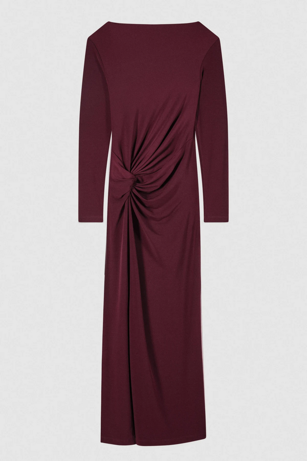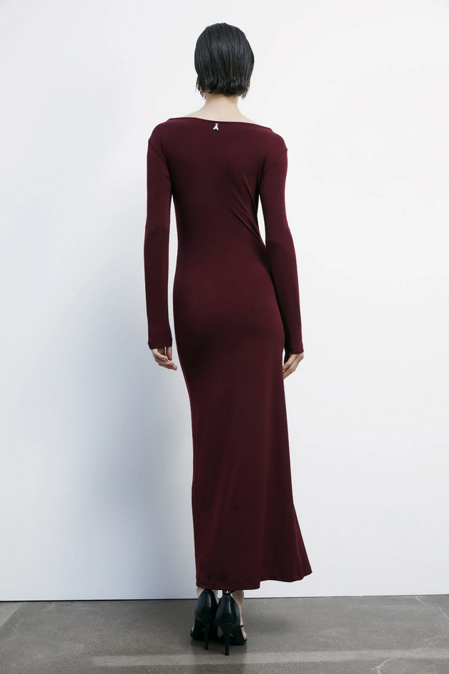 Abito lungo in jersey crêpe leggero, caratterizzato da un drappeggio sofisticato che valorizza la sensualità del design minimal. Aderente e avvolgente, segue naturalmente la silhouette per aprirsi in uno spacco laterale che dona carattere al movimento. Presenta vestibilità slim, maniche aderenti extra lunghe, scollo a barca e logo Fly sul retro del collo. La modella è alta 176 cm e indossa la taglia IT 40/S/0. Composizione: tessuto principale 95% poliestere, 5% elastan. Cura del capo: lavare a mano o delicatamente a secco con tetracloroetilene. Codice prodotto 2A2963-J333M536 A25