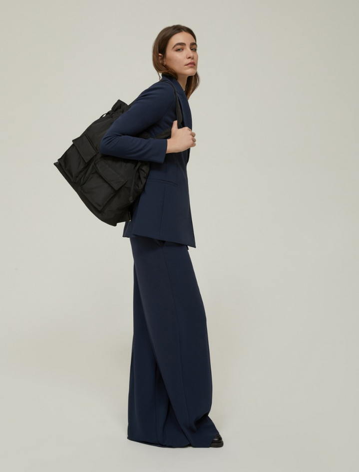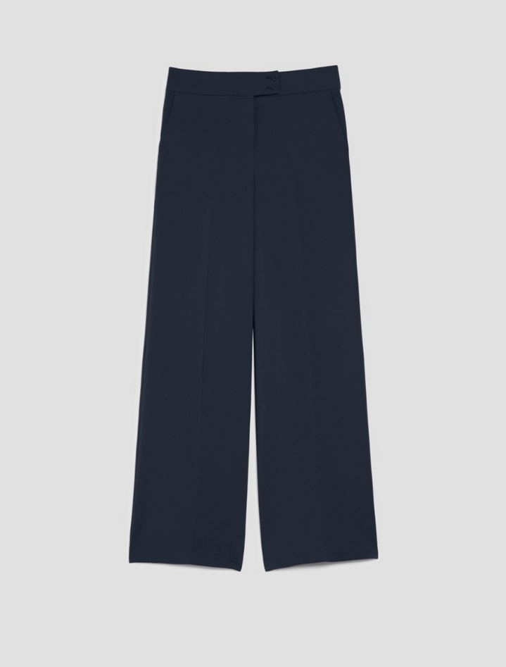 Pantaloni eleganti dal design fluido che reinterpretano lo stile sartoriale classico in chiave contemporanea. Realizzati in cady bi-stretch, presentano una gamba ampia e diritta con vita regolare, per una vestibilità confortevole e raffinata. Le tasche alla francese sul davanti e quelle a filo sul retro aggiungono un tocco di praticità, mentre la piega stirata definisce la linea impeccabile del capo. La chiusura con zip nascosta e bottoni ricoperti in tessuto completa il look. Perfetti con il blazer coordinato per un completo dall'eleganza disinvolta. Composizione: 92% poliestere, 8% elastan. Lavaggio: lavare in lavatrice a massimo 30° con azione meccanica ridotta, non candeggiare, non asciugare in tamburo, asciugare appeso all'ombra, stirare a temperatura massima di 120°, lavare a secco delicato con percloroetilene. Codice prodotto EMBLEMA 2521136062200005 A25