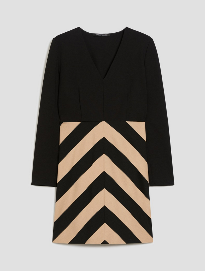 Abito in jersey dalla silhouette bon chic, impreziosito da giochi di righe che disegnano raffinati motivi grafici. Realizzato in morbido jersey a punto Milano in blend di viscosa stretch, unisce eleganza e comfort per accompagnare con stile ogni occasione. Il top aderente e la vita delineata valorizzano la figura, mentre la gonna leggermente svasata assicura movimento e femminilità. Completa il design lo scollo a V e le maniche lunghe, con zip invisibile al fianco per una chiusura discreta. Capo sfoderato. Composizione: parte inferiore 63% viscosa, 31% poliammide, 6% elastan; parte superiore 65% viscosa, 30% poliammide, 5% elastan. Lavaggio: lavare a mano in acqua fredda max 40°, non candeggiare, non asciugare in tamburo, asciugare in piano all'ombra, ferro tiepido max 120 gradi c, lavare a secco delicato con percloroetilene, non lavare ad umido professionale, non lasciare in ammollo. Codice prodotto FINISH 2521626036200001 A25