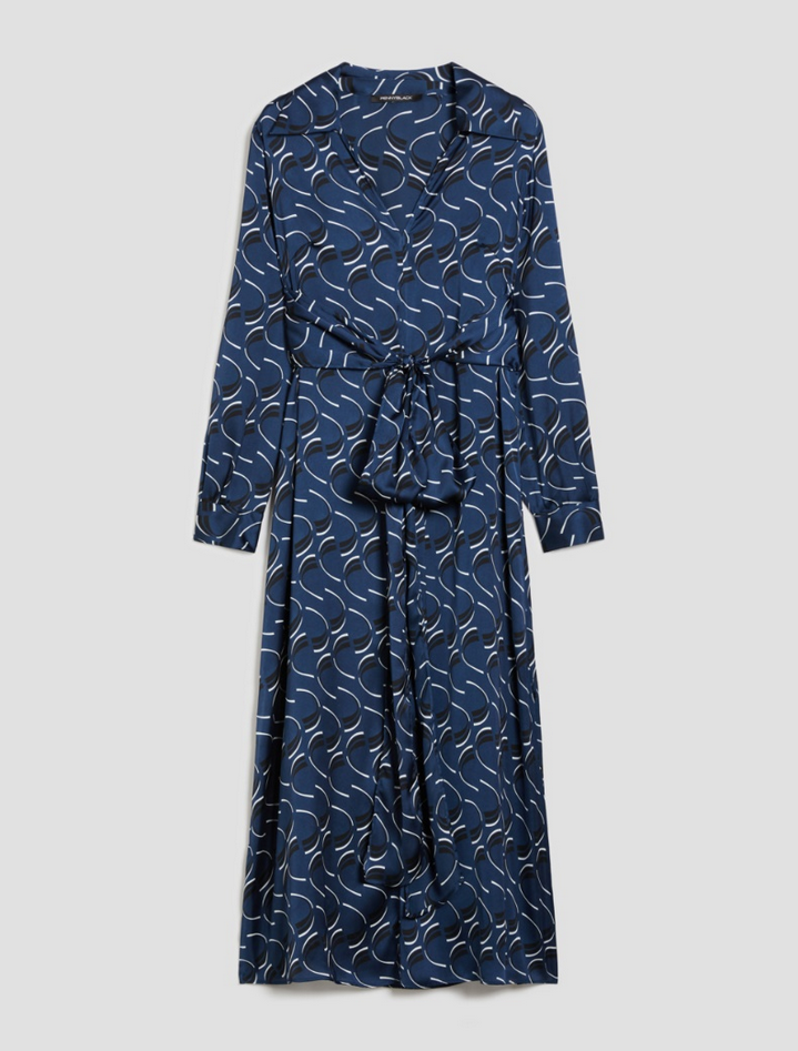 Abito midi in raso fluido stampato, perfetto dall'ufficio all'aperitivo grazie alla sua versatilità e al design raffinato. Le linee diritte e morbide sono valorizzate dalle fusciacche da annodare in vita, che definiscono la silhouette con eleganza. Il colletto aperto e lo scollo a V donano un tocco femminile, mentre le maniche lunghe con polsi a camicia e gli spacchi laterali al fondo completano il look con leggerezza. Capo sfoderato. Composizione: 100% poliestere. Lavaggio: in lavatrice a massimo 30°C con azione meccanica ridotta; non candeggiare; non asciugare in tamburo; asciugare appeso all'ombra; stirare a temperatura massima di 120°C; lavare a secco delicato con percloroetilene; lavare il capo allacciato e rovesciato; contiene parti non tessili di origine animale. Codice prodotto LIONE 2521226063200004 A25