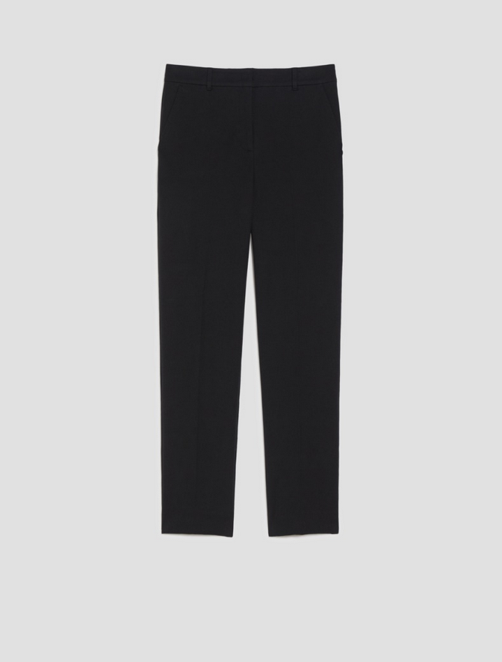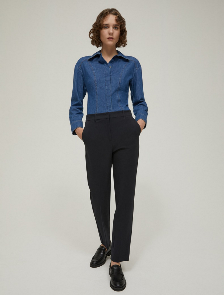 Essenziali e versatili, i pantaloni dal taglio slim sartoriale sono la base ideale per molteplici abbinamenti. Realizzati in twill di cotone e viscosa bi-stretch, seguono linee affusolate che valorizzano la silhouette mantenendo un comfort impeccabile. La vita regolare con passanti, la piega stirata e le tasche alla francese sul davanti con tasche a filo sul retro definiscono un look pulito e sofisticato. Chiusura nascosta con gancio e zip. Composizione: 53% cotone, 41% viscosa, 6% elastan. Lavaggio: in lavatrice a 30° con ridotta azione meccanica; non candeggiare; non asciugare in tamburo; asciugare appeso all'ombra; ferro tiepido max 120°C; lavare a secco con percloroetilene. Codice prodotto PENNYNY 2521136023200006 A25