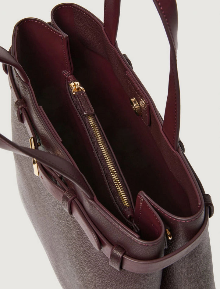 Tote in tessuto spalmato con effetto bottalato, manici e cintura dall'effetto spazzolato, tracolla lunga regolabile e rimovibile, chiusura con calamita, interno foderato con comparto centrale zippato, logo M in metallo con finitura oro chiaro. Dimensioni: 29,5 x 12 x 30,5 cm. Composizione: borsa in poliestere con spalmatura in poliuretano, interno in poliestere con spalmatura in poliuretano. Codice prodotto SALERNO 2523516176270004 A25