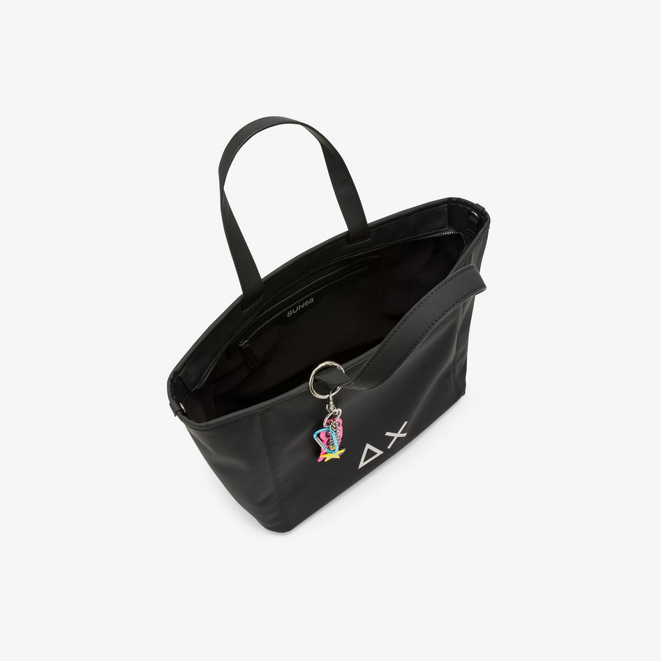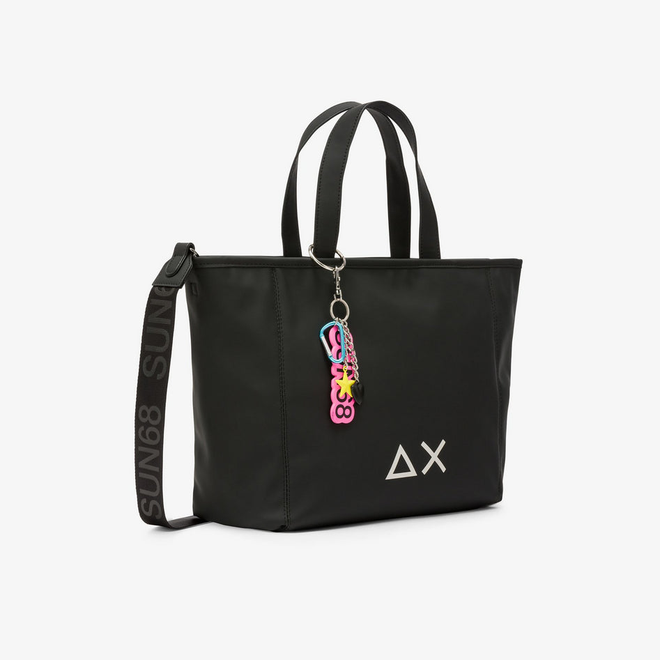 Jacqueline è l'iconica shopping bag SUN68 pensata per la città e il tempo libero. Il design capiente è valorizzato dai manici comodi e dalla tracolla in gros grain rimovibile, per portarla a mano, sotto il braccio o crossbody. I charms removibili e il maxi logo stampato completano l'accessorio con un tocco di brio. Shopper medium size in PU con chiusura a zip, tasca interna con zip. Composizione: 50% poliuretano, 50% poliestere. Codice prodotto Z4526011 A25