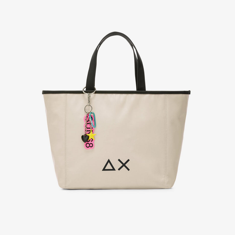 Jacqueline è l'iconica shopping bag SUN68 progettata per la città e il tempo libero. Capiente e versatile, può essere portata a mano, sotto il braccio o crossbody grazie ai manici comodi e alla tracolla in gros grain rimovibile. I charms removibili e il maxi logo stampato donano un tocco di brio e personalità. Shopper medium size in PU con chiusura a zip e tasca interna con zip. Composizione: 50% poliuretano, 50% poliestere. Codice prodotto Z4526089 A25