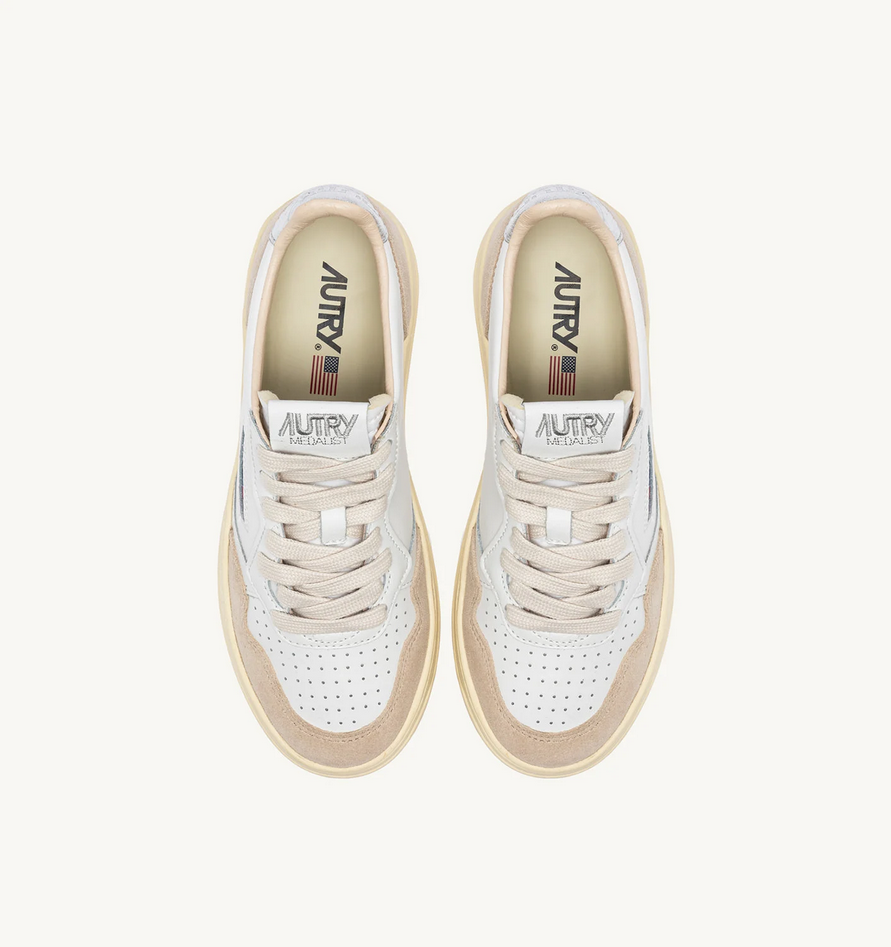 La Medalist Autry reinterpreta lo stile del tennis anni 80 fondendo vibe heritage e un'estetica dal taglio contemporaneo, con un design essenziale che la rende la sneaker quotidiana perfetta grazie al suo mood timeless e versatile, garantisce comfort quotidiano unendo stile intramontabile e funzionalità. La variante in pelle e suede regala un twist anche ai look più classici. Questa sneaker da donna è realizzata in pelle con suola in gomma per una calzata super confortevole e punta traforata che garantisce maggiore traspirabilità al piede, e si distingue per gli inserti in morbido suede che aggiungono al look una nota cool e disinvolta, completata dal talloncino posteriore con finish metallizzato color argento. Caratteristiche: tomaia in pelle, suede e nylon, punta con microfori, lacci piatti in cotone, label con ricamo cucita sulla linguetta, colletto imbottito, fodera in pelle, spugna e nylon, soletta in pelle rialzata di 2 cm, suola in gomma, altezza suola 2,5-3,5 cm, pochette personalizzata in tessuto. Composizione: tomaia 70% pelle bovina, 20% pelle scamosciata, 10% nylon, fodera 40% pelle suina, 50% spugna, 10% nylon, suola 100% gomma.Codice prodotto AULWLS74 P26