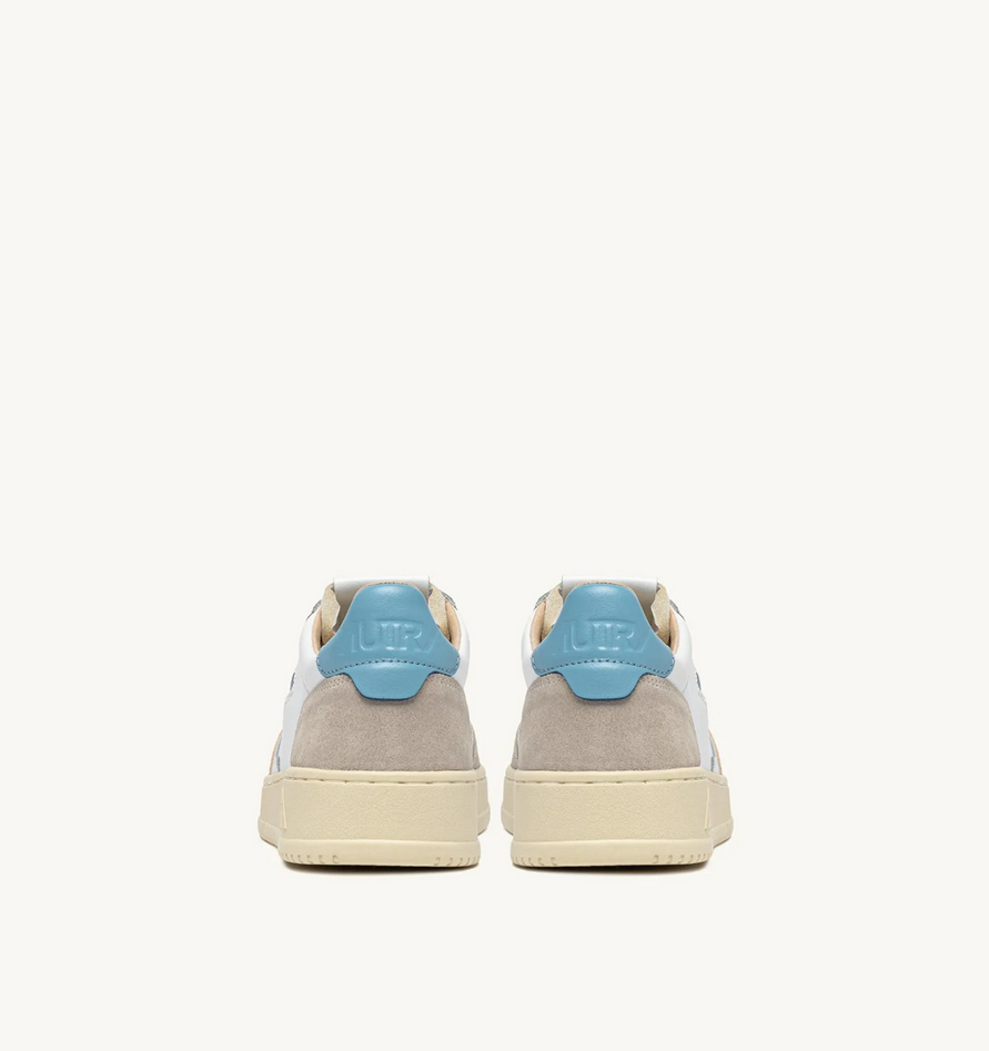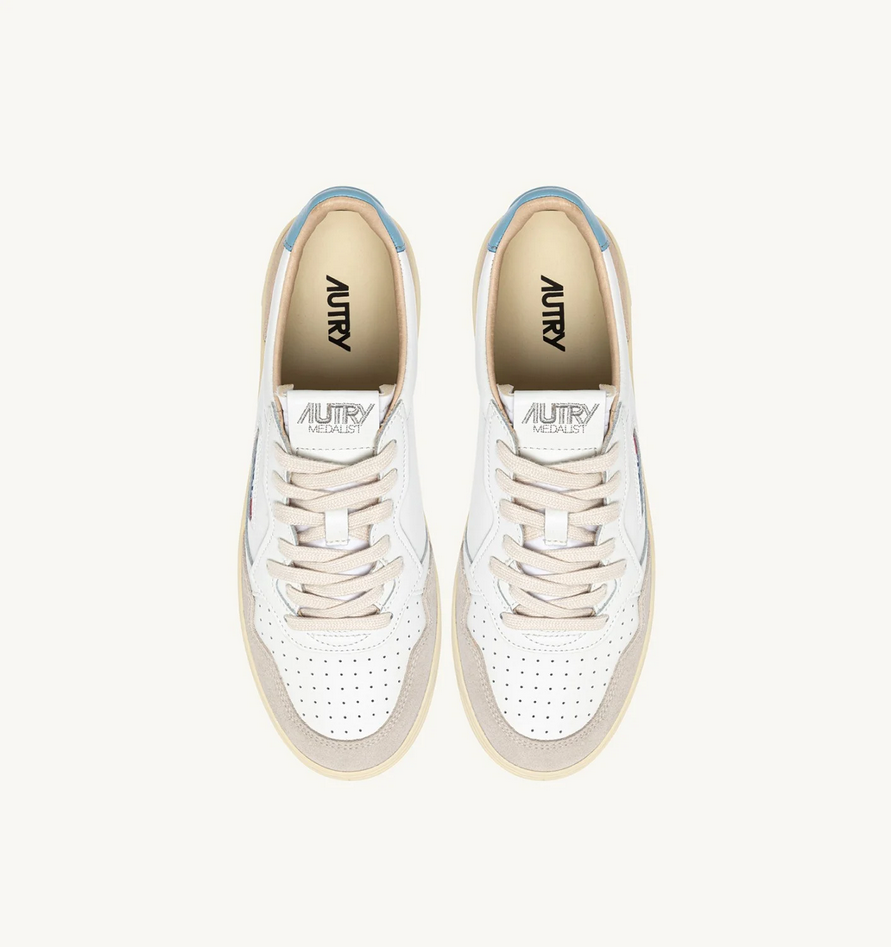 La Medalist Autry reinterpreta lo stile del tennis anni 80 fondendo vibe heritage e un'estetica dal taglio contemporaneo, con un design essenziale che la rende la perfetta sneaker quotidiana dal mood timeless e versatile, capace di garantire comfort e funzionalità; la variante in pelle e suede aggiunge un twist anche ai look più classici ed è realizzata in morbida pelle bianca dall'aspetto autentico, rifinita con rinforzi in suede beige e talloncino celeste per un mix tattile e grafico deciso, completata da dettagli in pelle su tallone e linguetta e da un inserto laterale jacquard personalizzati con il logo Autry per un ulteriore tocco di autenticità. Caratteristiche: tomaia in pelle e suede, punta con microfori, lacci piatti in cotone, label con ricamo cucita sulla linguetta, colletto imbottito, fodera in pelle e spugna di cotone, soletta in pelle rialzata di 2 cm, suola in gomma, altezza suola 2,5-3,5 cm, pochette personalizzata in tessuto. Composizione: tomaia 80% pelle, 20% suede, fodera 40% pelle, 50% spugna di cotone, 10% nylon, suola 100% gomma. Codice prodotto AULMLS12 P26