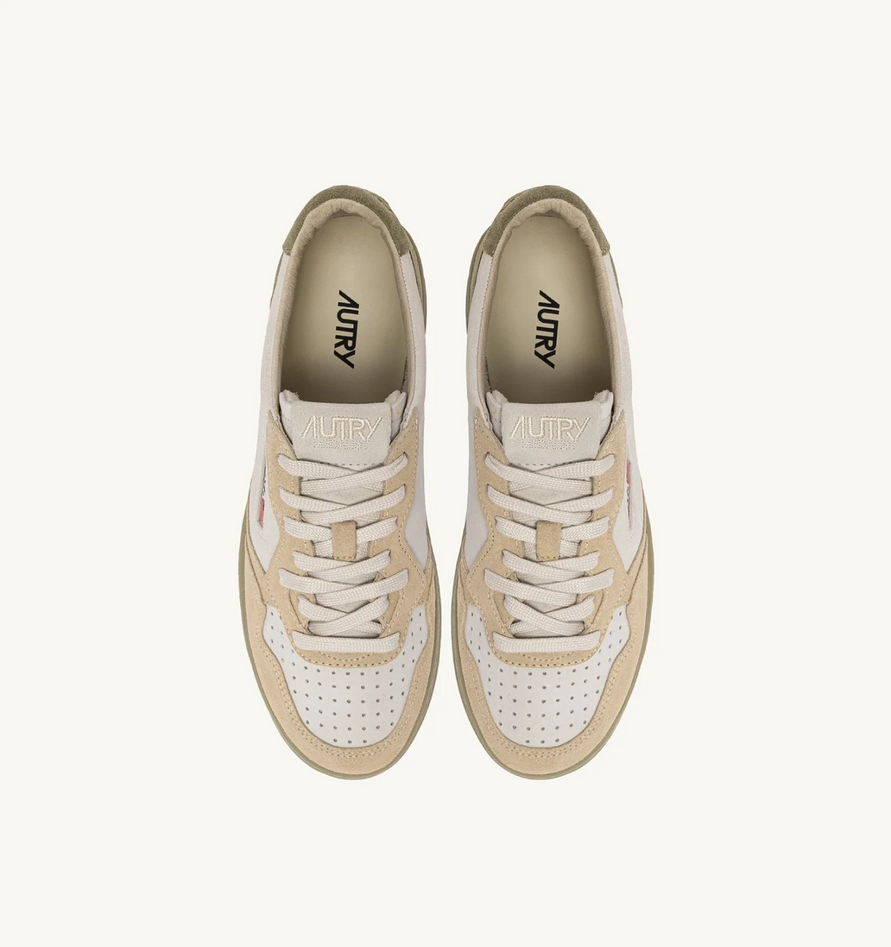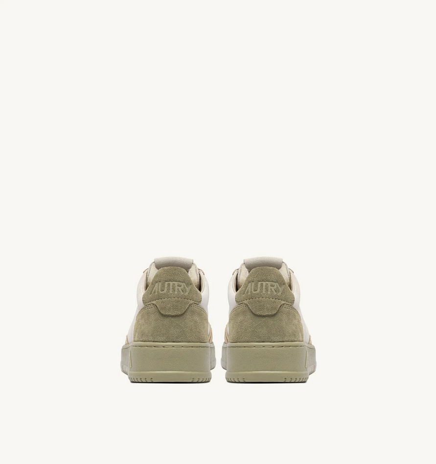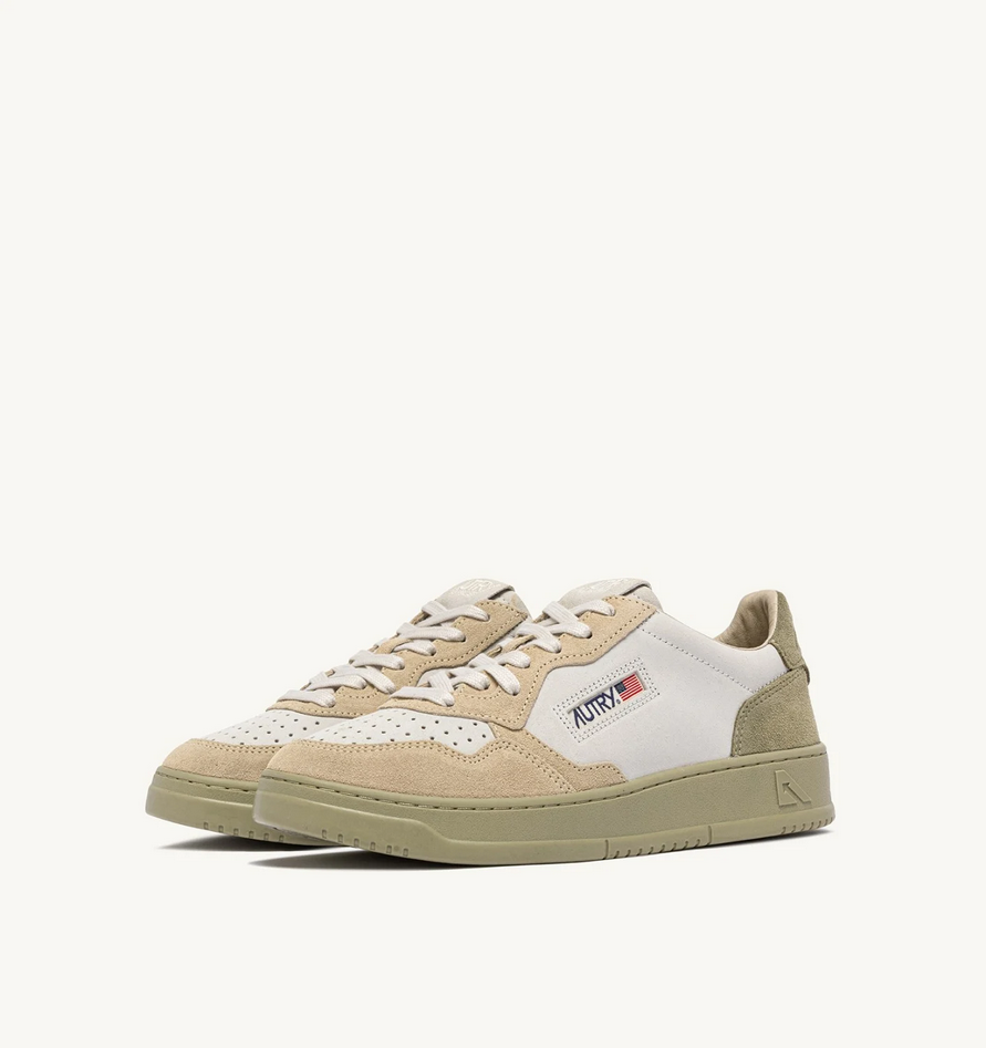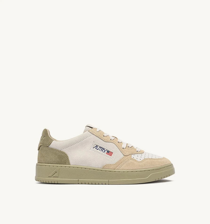 La Medalist Autry reinterpreta lo stile del tennis anni 80 fondendo vibe heritage e un'estetica dal taglio contemporaneo, con un design essenziale che la rende la sneaker quotidiana perfetta dal mood timeless e versatile, capace di garantire comfort e funzionalità; questa variante propone il mix perfetto di shades color-block in suede ed è realizzata in morbido e pregiato suede tricolore bianco, verde e beige, per un effetto autentico e di forte personalità, con punta microforata che assicura un'ottima traspirabilità e dettagli su linguetta, lato esterno e tallone personalizzati con il logo Autry per un tocco di autenticità contemporanea. Caratteristiche: tomaia in suede, punta con microfori, lacci piatti in cotone, label con ricamo cucita sulla linguetta, colletto imbottito, fodera in pelle e spugna di cotone, soletta in pelle rialzata di 2 cm, suola in gomma, altezza suola 2,5-3,5 cm, pochette personalizzata in tessuto. Composizione: tomaia 100% suede, fodera 40% pelle, 50% spugna di cotone, 10% nylon, suola 100% gomma. Codice prodotto AULMTS11 P26