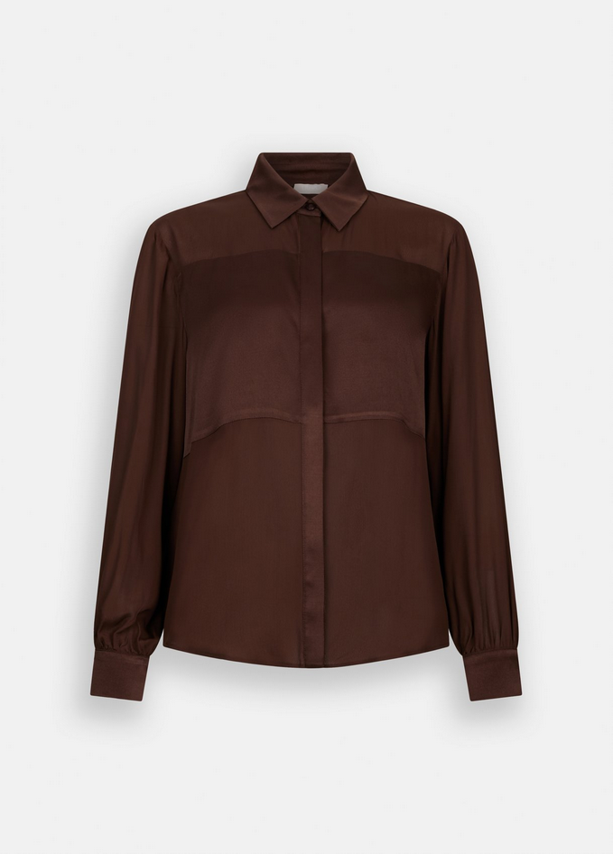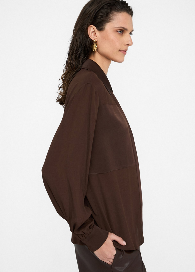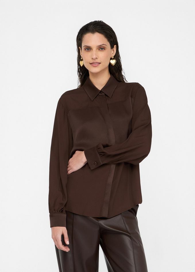 Camicia in crêpe de chine con inserti in raso ton sur ton e chiusura con bottoni nascosti. Composizione: tessuto principale 100% viscosa, tessuto secondario 100% viscosa. Lavaggio: non lavare in acqua, non trattare con cloro, lavare delicatamente a secco con tetracloroetilene, lavare a rovescio e in sacchetto di rete. Asciugatura: non usare asciugatrice. Stiraggio: stirare a temperatura massima 110 °C, interponendo un panno. Codice prodotto MF5106 T257890915 A25