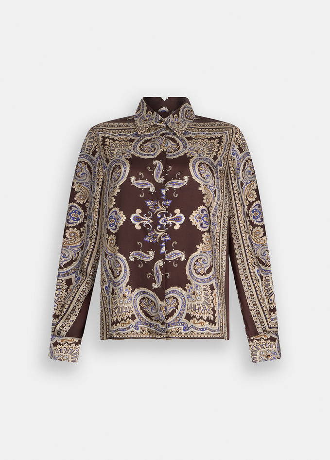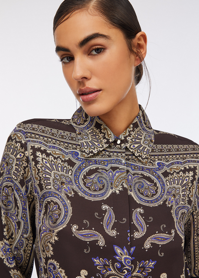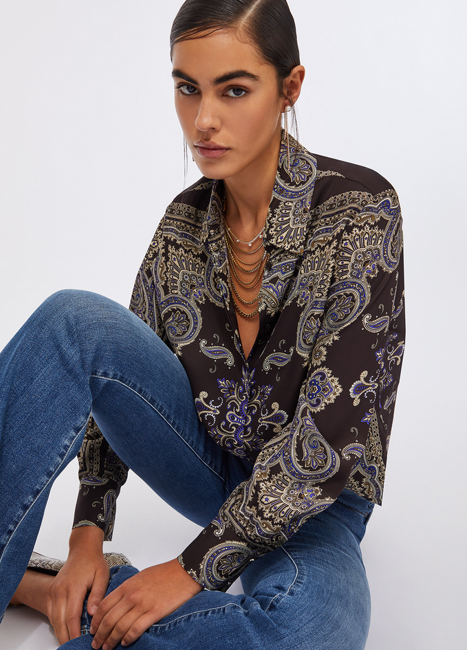 Camicia in twill di viscosa con stampa all over e vestibilità regular fit. Composizione tessuto principale 100% viscosa. Non lavare in acqua, non trattare con cloro, lavare delicatamente a secco con tetracloroetilene e a rovescio, non usare asciugatrice, stirare a temperatura massima 110 °C interponendo un panno ed evitando le decorazioni. Codice prodotto MF5393 TS117P9141 A25