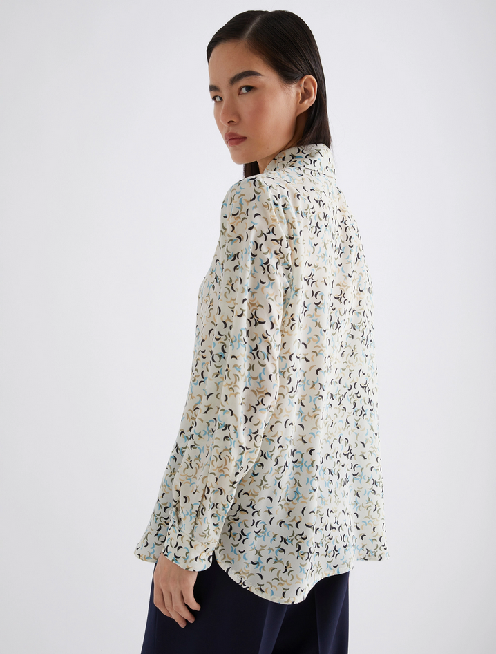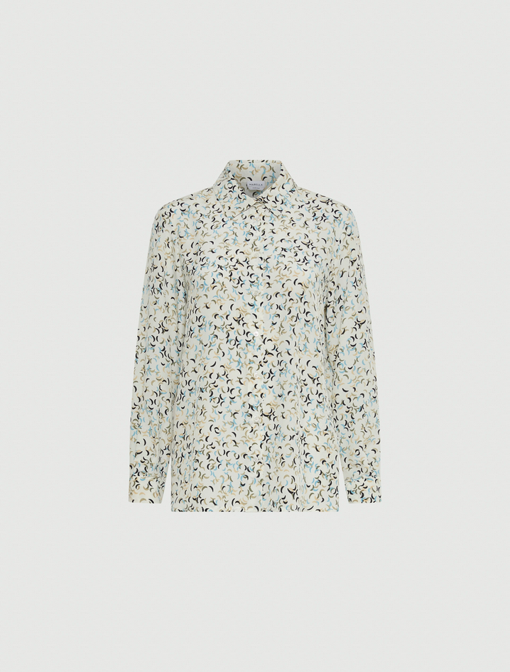 La raffinata essenzialità della camicia si rinnova in versione deluxe con una proposta in pura seta, impreziosita da una delicata stampa all over che ne esalta l'originalità. Il fit regolare, gli spacchetti laterali e il fondo stondato la rendono perfetta anche da indossare fuori dai pantaloni. Realizzata in crêpe de Chine di seta stampata, presenta collo classico, abbottonatura a vista e un design femminile e fluido. Composizione: 100% seta. Lavaggio: lavare a mano in acqua fredda max 40°; non candeggiare; non asciugare in tamburo; asciugare appeso all'ombra; ferro tiepido max 120°C; lavare a secco delicato con percloroetilene; non lavare ad umido professionale; contiene parti non tessili di origine animale. Codice prodotto TUNDRA 2523116161270001 A25