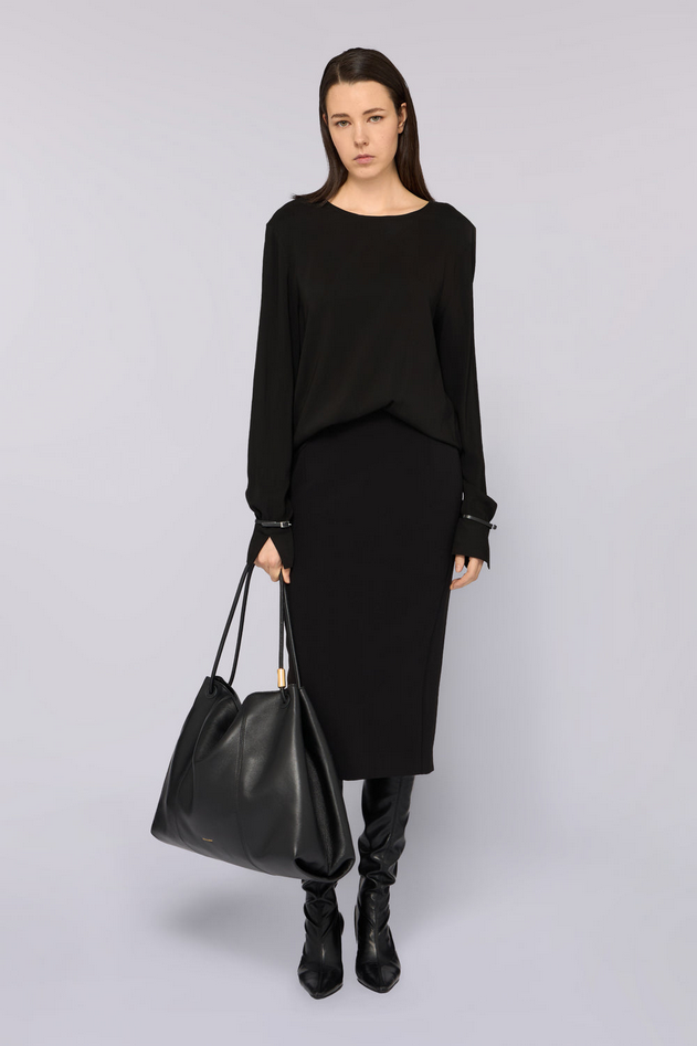 Stile senza tempo e raffinatezza si fondono in una blusa dal taglio essenziale, realizzata in tessuto fluido di viscosa che disegna una silhouette morbida e femminile; lo scollo a V sulla schiena aggiunge un tocco di elegante discrezione, mentre le fibbie decorative sui polsi, dettaglio distintivo che richiama l'heritage artigianale di Trussardi, conferiscono un'eleganza sofisticata. Versatile e chic, questa blusa si adatta perfettamente sia all'ufficio sia alle occasioni speciali, abbinandosi con naturalezza a pantaloni sartoriali o a una gonna a matita per un look impeccabile e contemporaneo. Realizzata in tessuto fluido di viscosa, con scollo a V sulla schiena, fibbie decorative sui polsi e vestibilità regular. Nessun lavaggio in acqua, non asciugare a tamburo, non usare candeggina, lavaggio a secco P moderato, stiro max 110° C. Composizione tessuto principale: 94% viscosa, 6% elastan. Codice prodotto 2537A0 09QR33 A25