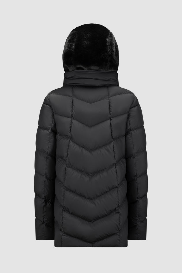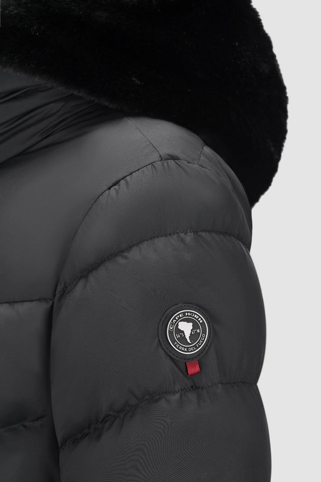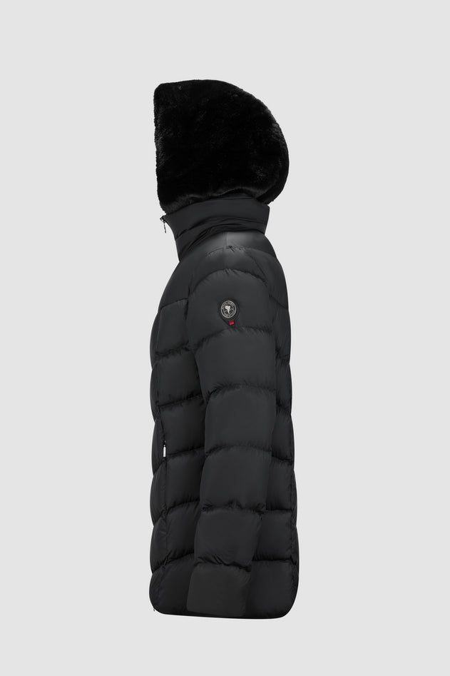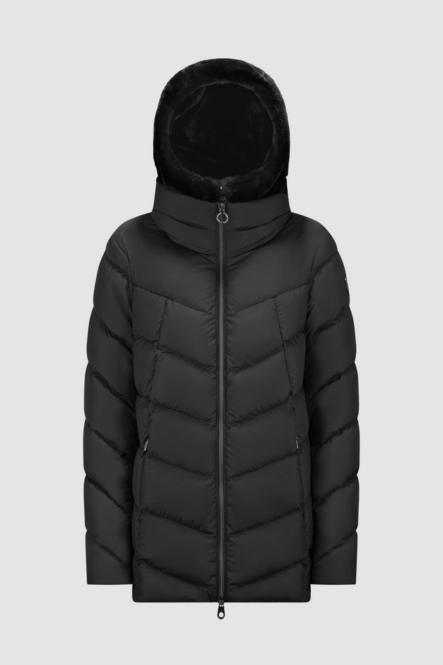 Piumino da donna trapuntato a modello a campana con vestibilità regolare sulle spalle, imbottitura in piuma naturale certificata per calore e leggerezza, cappuccio e pettorina in ecopelliccia removibili, zip centrale a spirale con doppio cursore e puller personalizzati, zip invisibili laterali per maggiore libertà di movimento, due tasche interne portadocumenti, resistente al freddo fino a -10°C, tessuto esterno 100% poliestere dall'aspetto opaco con proprietà antispiumaggio, idrorepellente e antimacchia, fodera interna 100% poliammide, imbottitura in piuma naturale certificata JIS 90% fiocco, trattata e sanificata, filling power 800 cuin, pelliccia ecologica, vestibilità morbida, lavaggio delicato a 30°C in lavatrice, asciugare a bassa temperatura con asciugatrice, non stirare, non lavare a secco, non usare candeggina, rimuovere la pettorina in pelo prima del lavaggio. Codice prodotto B2566500 A25