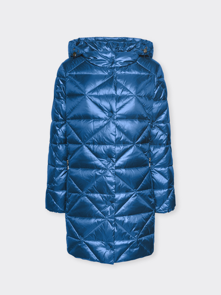 Piumino lungo in nylon antigoccia con trapuntatura a disegno origami, dotato di tasche con zip e interni in fodera calda, chiusura frontale con bottoni automatici, collo alto e cappuccio rimovibile, interno in vera piuma ideale per le temperature più basse. Lavaggio delicato a 30°, non asciugare a tamburo, non usare candeggina, lavaggio a secco P moderato, stirare con temperatura massima 110°. Composizione: tessuto principale 100% poliammide, fodera principale 100% poliammide, seconda fodera 100% poliestere, interno principale 80% piumino, 20% piume. Codice prodotto F895P009MT24 A25