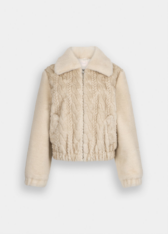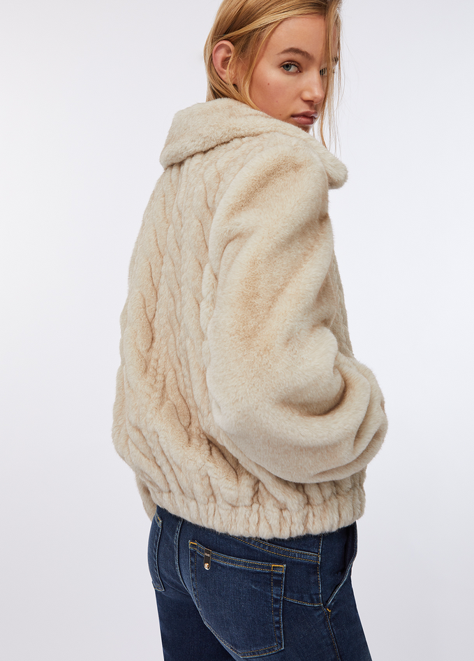 Bomber in morbido tessuto teddy con trecce sul davanti, colletto oversize, comode tasche e chiusura con zip. Rifinito con elastico sul fondo e sui polsi per un fit confortevole. Composizione: tessuto principale 100% poliestere, fodera principale 100% poliestere, spalmatura 100% resina poliuretanica, tessuto secondario 100% poliestere, fodera secondaria 100% poliestere. Lavaggio: non lavare in acqua, non trattare con cloro, lavare delicatamente a secco con tetracloroetilene, lavare a rovescio. Asciugatura: non usare asciugatrice, asciugare appeso e spazzolare il tessuto dopo il lavaggio. Stiraggio: non stirare. Codice prodotto MF5094 E1044W9868 A25