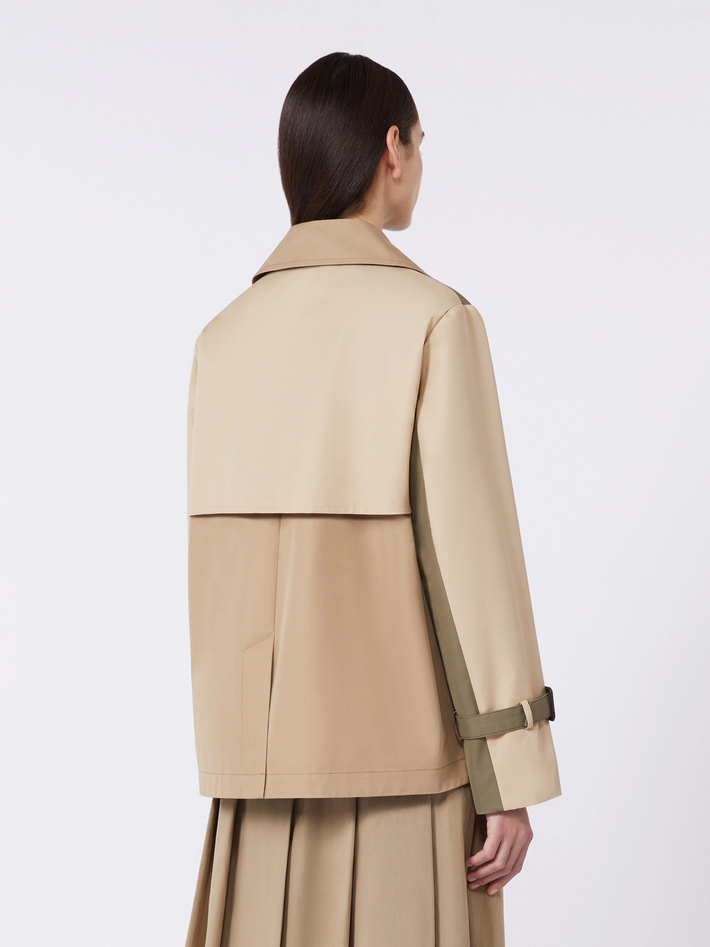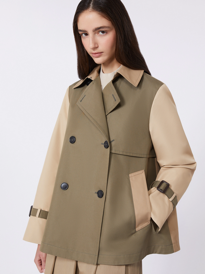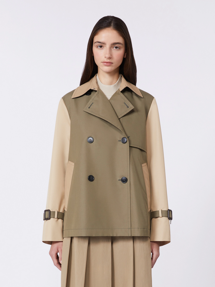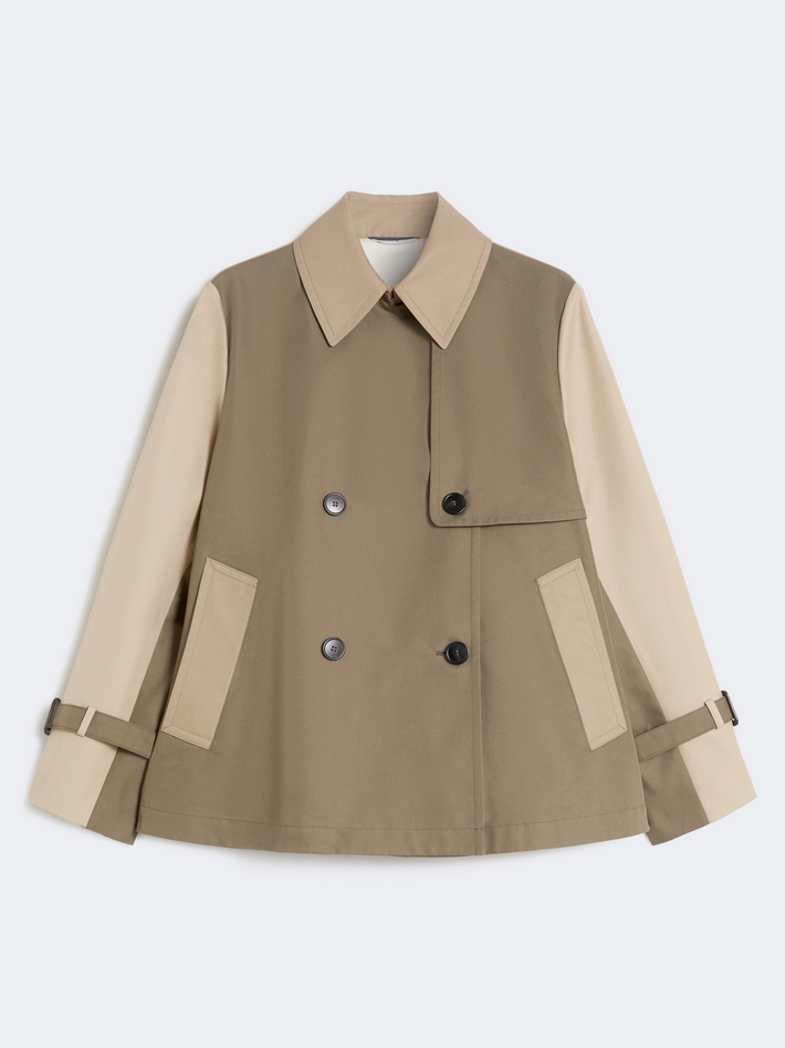 Trench corto doppiopetto caratterizzato da bavolet sul davanti e alamari ai polsi, realizzato in gabardina tecnica antigoccia con linea leggermente svasata e spacco centrale sul retro. Presenta collo a rever a doppio uso, maniche lunghe a giro, chiusura con bottoni e tasche a filettone sui fianchi, è foderato e rifinito con logo Weekend Max Mara stampato nella fodera interna dello sprone. Composizione e lavaggio: tessuto 65% cotone, 35% poliestere; fodera 100% cotone; fodera maniche 50% poliestere, 50% viscosa. Non lavare in acqua, non candeggiare, non asciugare in tamburo, ferro tiepido max 120 gradi C, lavare a secco delicato con percloroetilene, non lavare ad umido professionale, staccare la fibbia prima del lavaggio, contiene parti non tessili di origine animale. Codice prodotto WKDBIGLIA 2615021051600029 P26