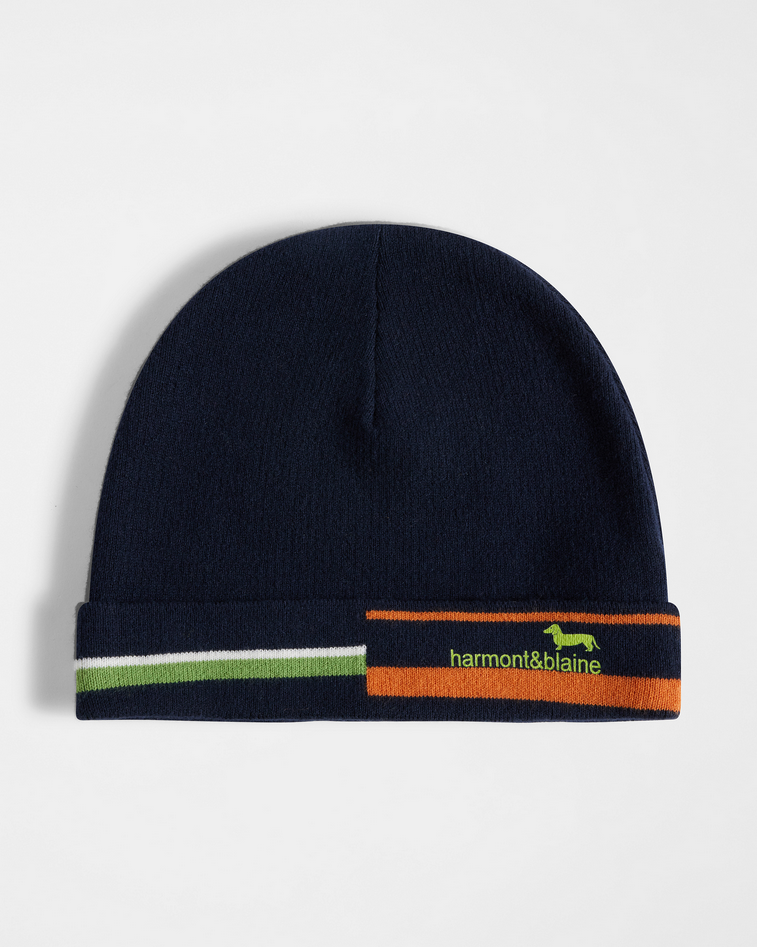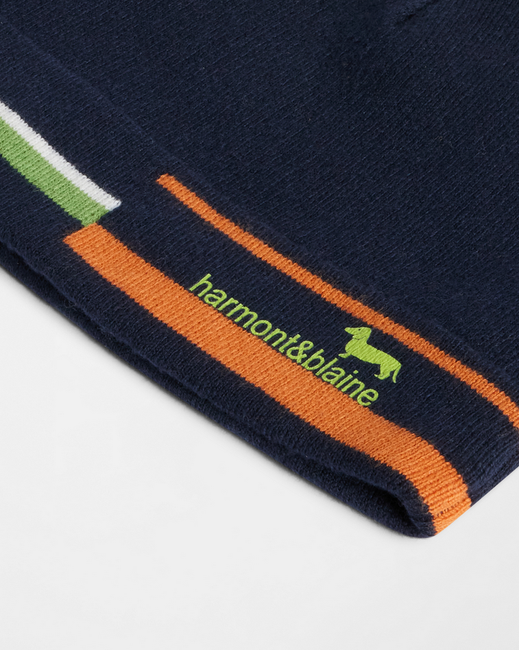 Harmont & Blaine reinventa l'accessorio invernale per eccellenza e presenta un beanie da uomo realizzato in un morbido e confortevole mix di cotone e lana. Ideale per essere abbinato a un look vivace oppure per ravvivare un outfit tinta unita, l'accessorio è animato sul risvolto da un motivo a righe sfalsate a contrasto, per un originale effetto color block. A impreziosire il design troviamo il lettering del brand a contrasto accompagnato dal bassotto Blaine, l'emblematico logo della maison. Composizione: 60% cotone, 40% lana. Lavaggio: a mano, non candeggiare, non centrifugare, stirare a bassa temperatura, non lavare a secco. Codice prodotto N0P184030788801 A25