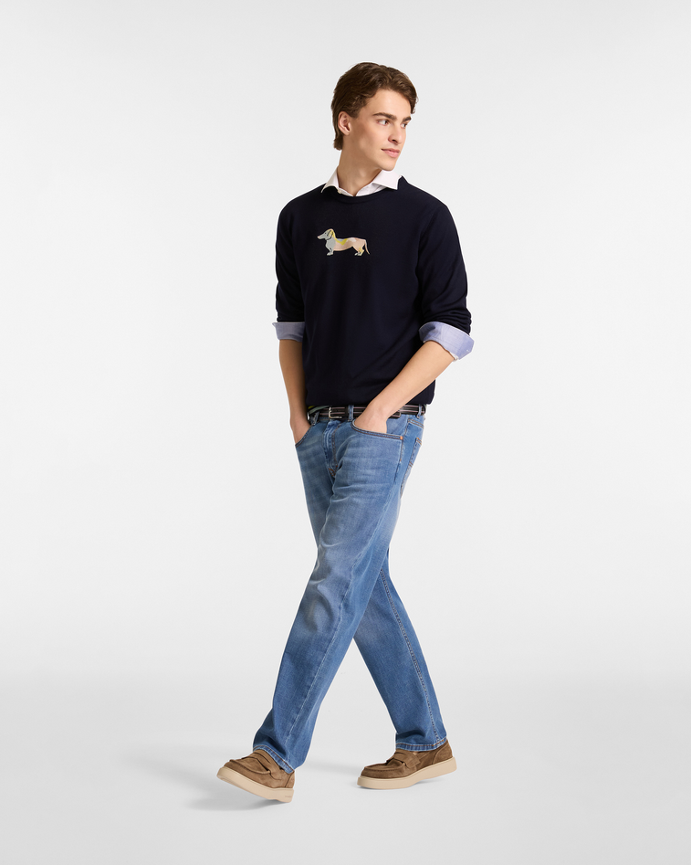 L'estro creativo di Harmont & Blaine si esprime ancora una volta con questo pullover girocollo da uomo in pura lana pronto a dare un tocco di vivacità ai vostri outfit per il tempo libero, il design essenziale del capo è infatti ravvivato da un brioso motivo a righe bicolor su interno collo, polsini e fondo capo lavorati a costine e dall'iconico bassotto che spicca sul petto sotto forma di maxi ricamo a contrasto dalle tinte tenui e sfumate, la vestibilità regular in cui si presenta è ideale per non rinunciare alla comodità, cura e manutenzione: 100% lana, lavaggio a mano, non candeggiare, non centrifugare, stiratura a bassa temperatura. Codice prodotto HRP807030478801 A25