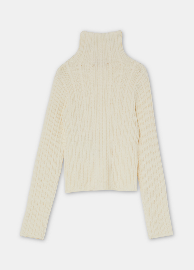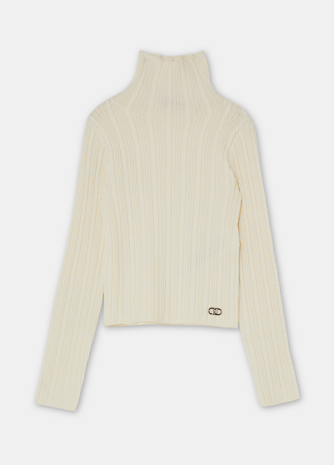 Dolcevita in filati misto cotone e viscosa, con lavorazione a trecce e logo monogram ricamato sul fondo. Prodotto "Liu Jo Better". Composizione: 61% poliestere, 22% cotone, 15% viscosa, 2% elastan. Codice prodotto GF5031 MA63Q71322 A25