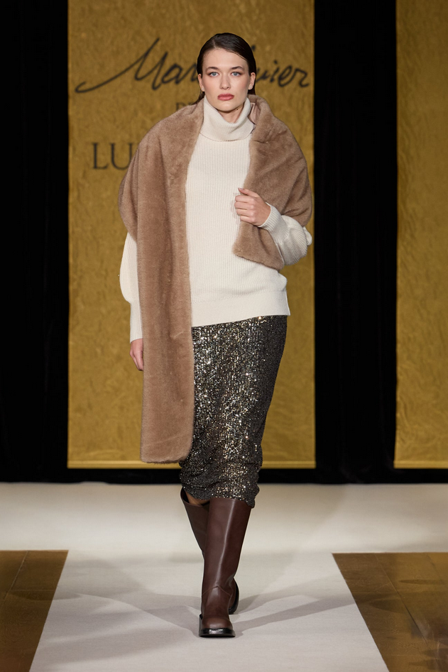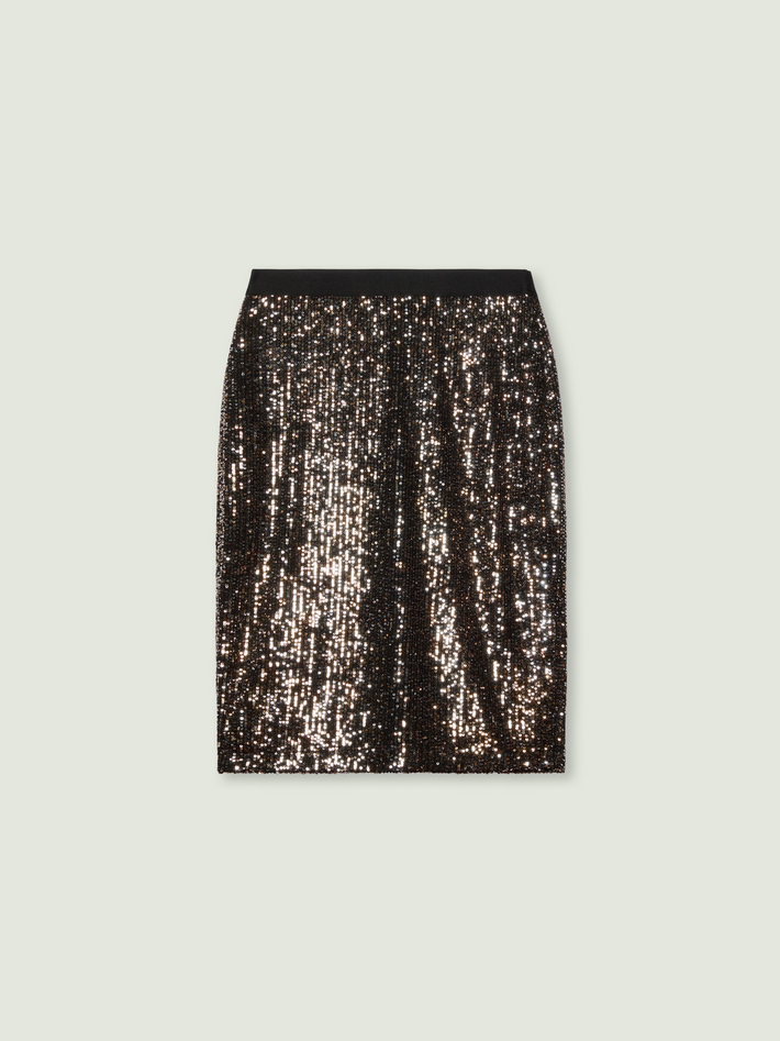 Gonna tubino realizzata in tulle ricamato con paillettes bicolore platino e oro che creano un effetto elegante e sofisticato, con punto vita estensibile dotato di cinturino in gros grain elasticizzato, tessuto stretch e struttura foderata, abbinabile alla giacca o ad altri capi nello stesso tessuto. Composizione e lavaggio: 92% poliestere, 8% elastan; lavare a mano, non asciugare a tamburo, non stirare, non lavare a secco. Codice prodotto 1023F0952122 A25