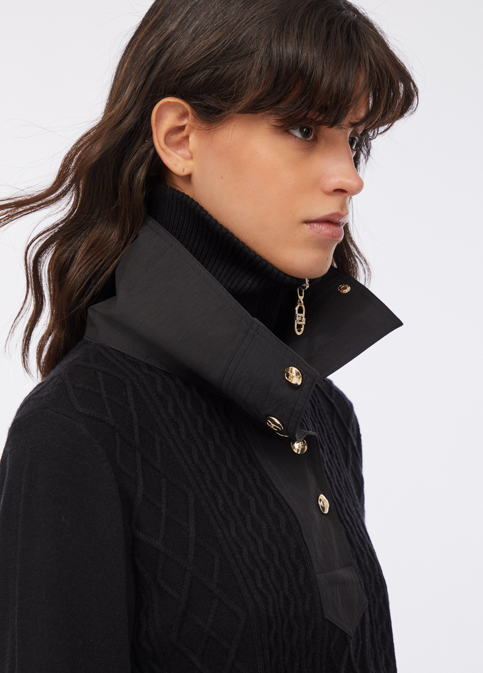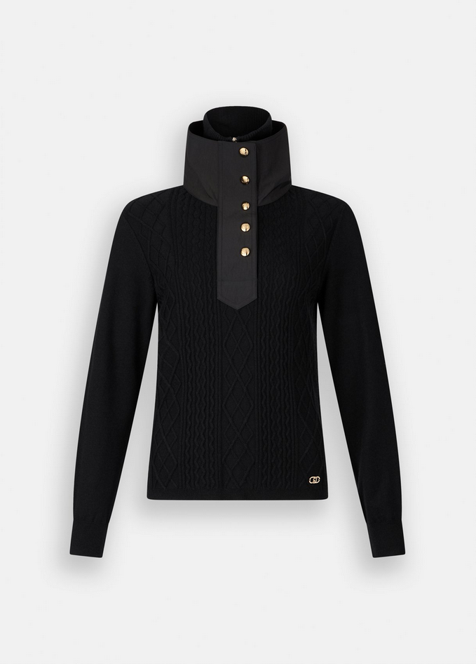 Maglia nera in misto viscosa con dettagli in nylon, collo alto con zip e bottoni a pressione, logo LJ in metallo al fondo, tirazip logata. Prodotto "Liu Jo Better". Composizione: tessuto principale 52% poliammide, 48% viscosa; tessuto secondario 60% poliestere, 40% poliammide. Lavaggio: lavare a mano, non trattare con cloro, non lavare a secco, lavare a rovescio, non strofinare, lavare con detersivo liquido. Asciugatura: non usare asciugatrice, asciugare in piano. Stiraggio: non stirare, stirare a max 110 °C interponendo un panno e senza stirare le decorazioni.Codice prodotto TF5039 MS75L22222 A25