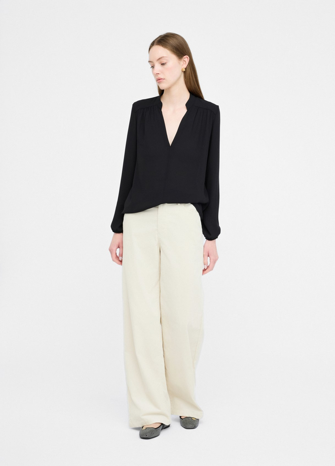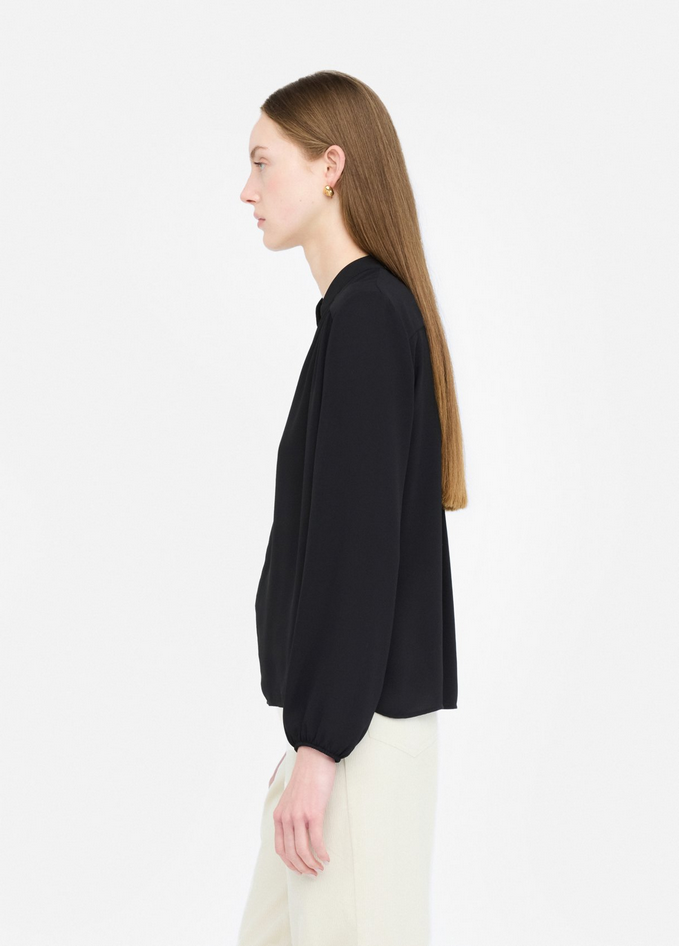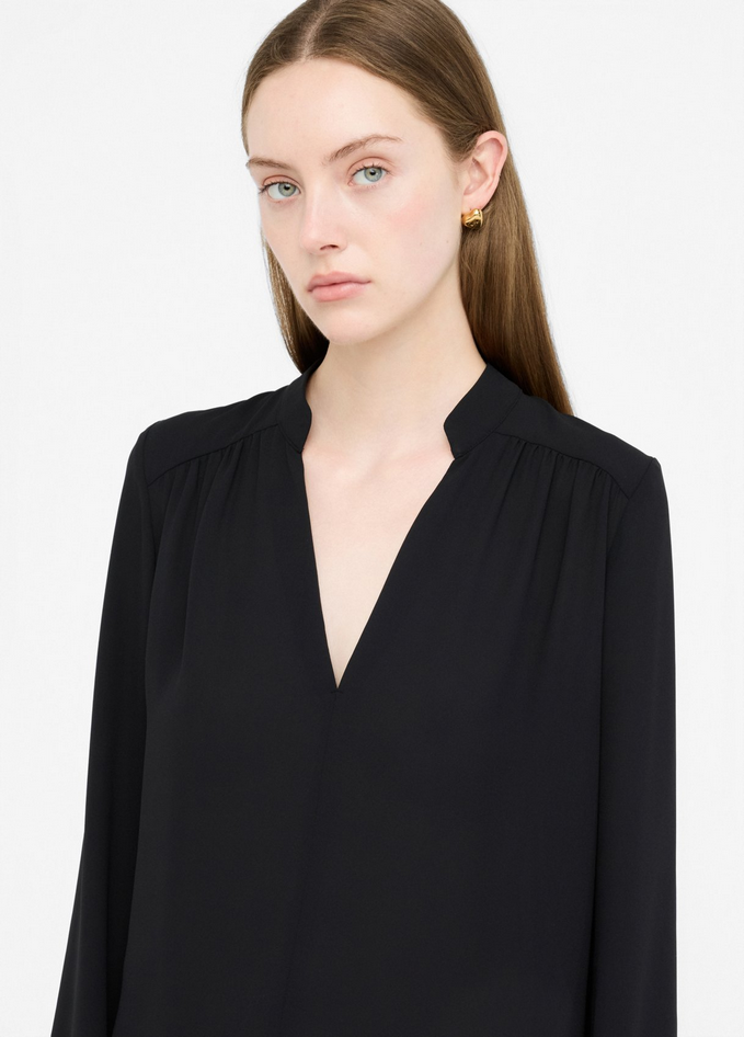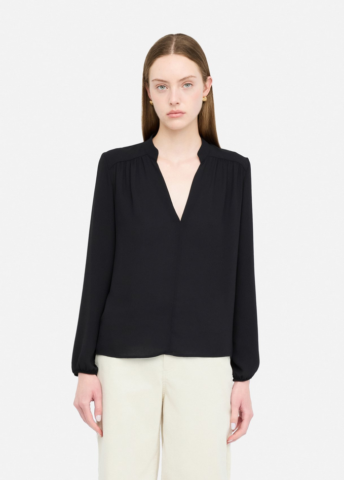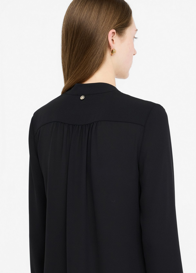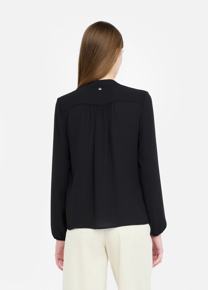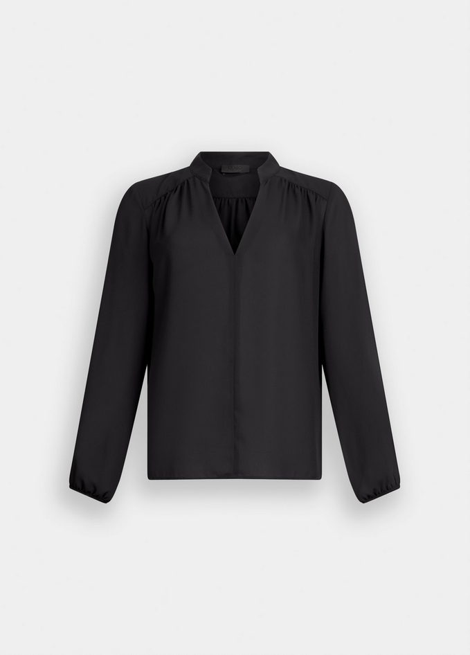 Blusa nera in georgette con collo alla coreana e motivo a V, maniche lunghe e polsi con elastico. Prodotto "Liu Jo Better". Composizione: tessuto principale 100% poliestere. Lavaggio: lavare a mano, non trattare con cloro, lavare delicatamente a secco con tetracloroetilene, lavare a rovescio. Asciugatura: non usare asciugatrice. Stiraggio: non stirare, stirare a temperatura massima 110°C, non stirare le decorazioni. Codice prodotto CF5413 TS86922222 A25