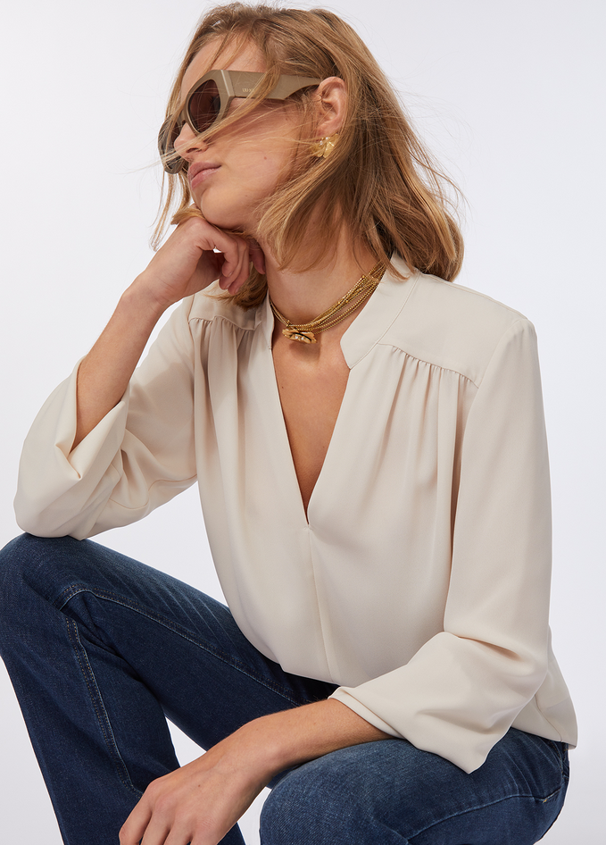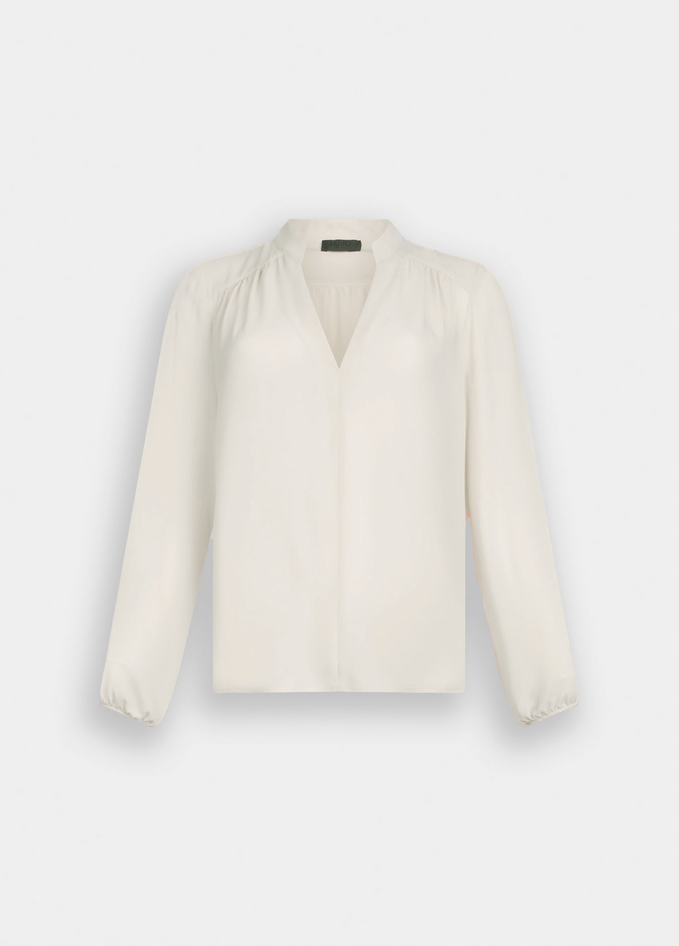 Blusa avorio in georgette con collo alla coreana e motivo a V, maniche lunghe e polsi con elastico. Prodotto "Liu Jo Better". Composizione: tessuto principale 100% poliestere. Lavaggio: lavare a mano, non trattare con cloro, lavare delicatamente a secco con tetracloroetilene, lavare a rovescio. Asciugatura: non usare asciugatrice. Stiraggio: non stirare, stirare a temperatura massima 110°C, non stirare le decorazioni. Codice prodotto CF5413 TS869X0726 A25