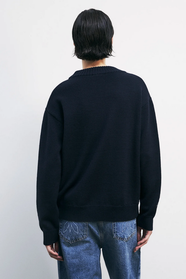 Maglione girocollo in maglia medio spessa (7 gauge) in filato misto lana e acrilica, vestibilità regolare, scollo rotondo, maniche lunghe, lavorazione rasata con logo jacquard sul davanti e logo Fly ricamato sulle maniche. Composizione: 50% lana, 50% acrilica; ricamo 100% poliestere. Lavare a mano seguendo le indicazioni sull'etichetta. Codice prodotto 8K0336-K282C789 A25