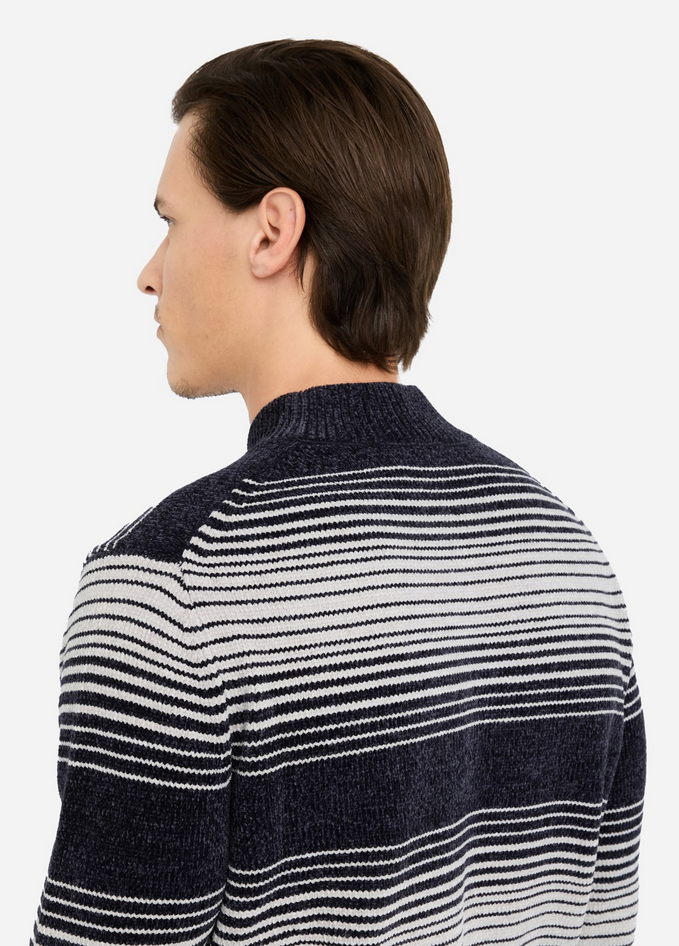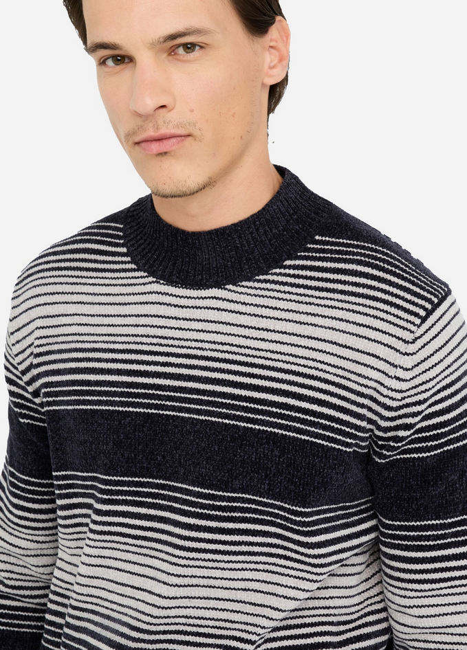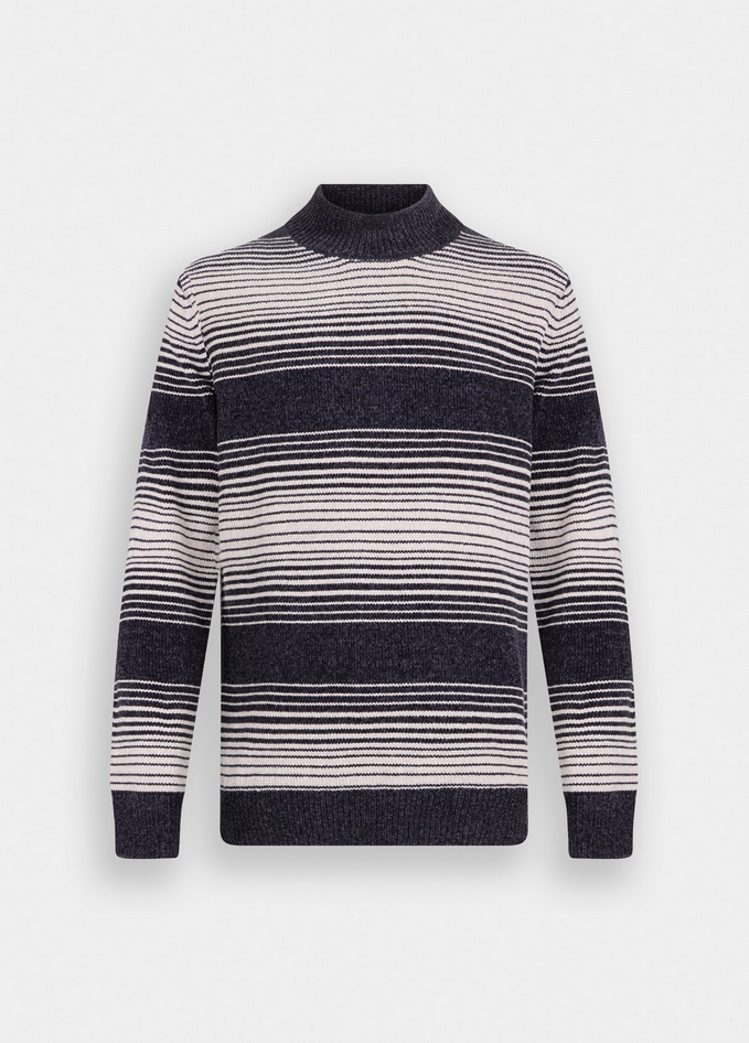Maglia blu e bianca realizzata in ciniglia, con motivo a righe jacquard, collo alto, maniche lunghe, bordi a costine e logo LJ al fondo. Composizione: 60% poliestere, 40% acrilico. Codice prodotto QF5234 MA29PC3848 A25