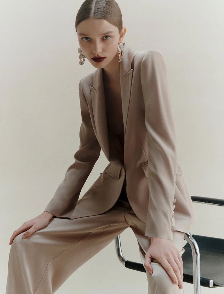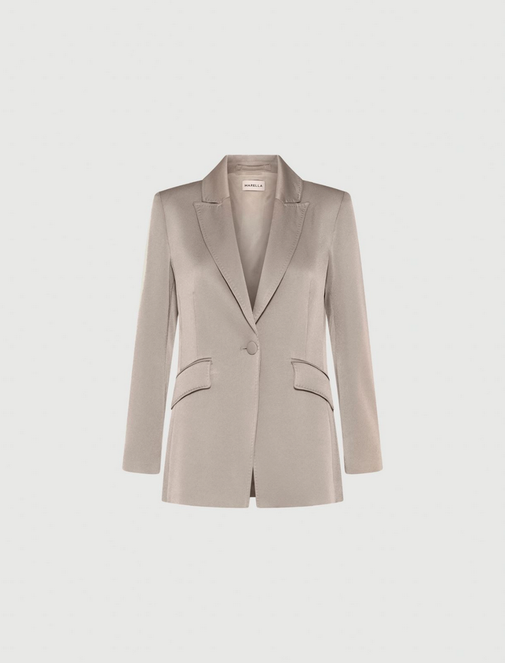 Giacca in satin triacetato con fodera interna, fit femminile regolare, rever, chiusura monopetto con bottone singolo, tasche oblique con patta e spacco centrale posteriore. Composizione: tessuto 82% triacetato, 18% poliestere; fodera 64% acetato, 36% poliestere. Lavaggio: non lavare in acqua, non candeggiare, non asciugare in tamburo, ferro tiepido max 120°C, lavare a secco delicato con percloroetilene, non lavare ad umido professionale. Codice prodotto COGNAC 2523046191270002 A25