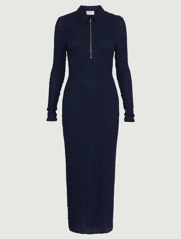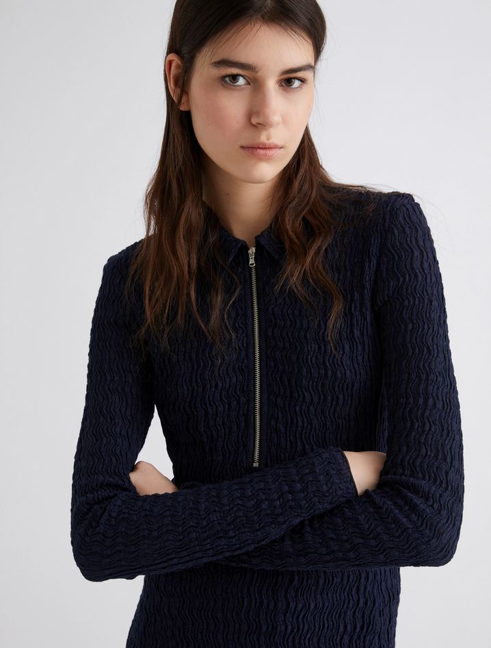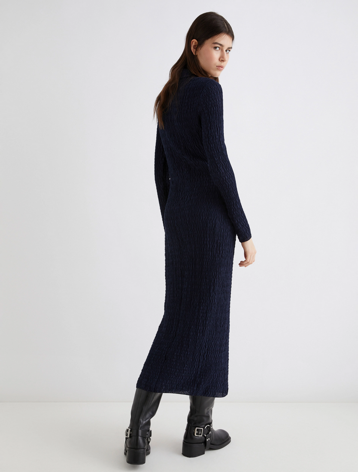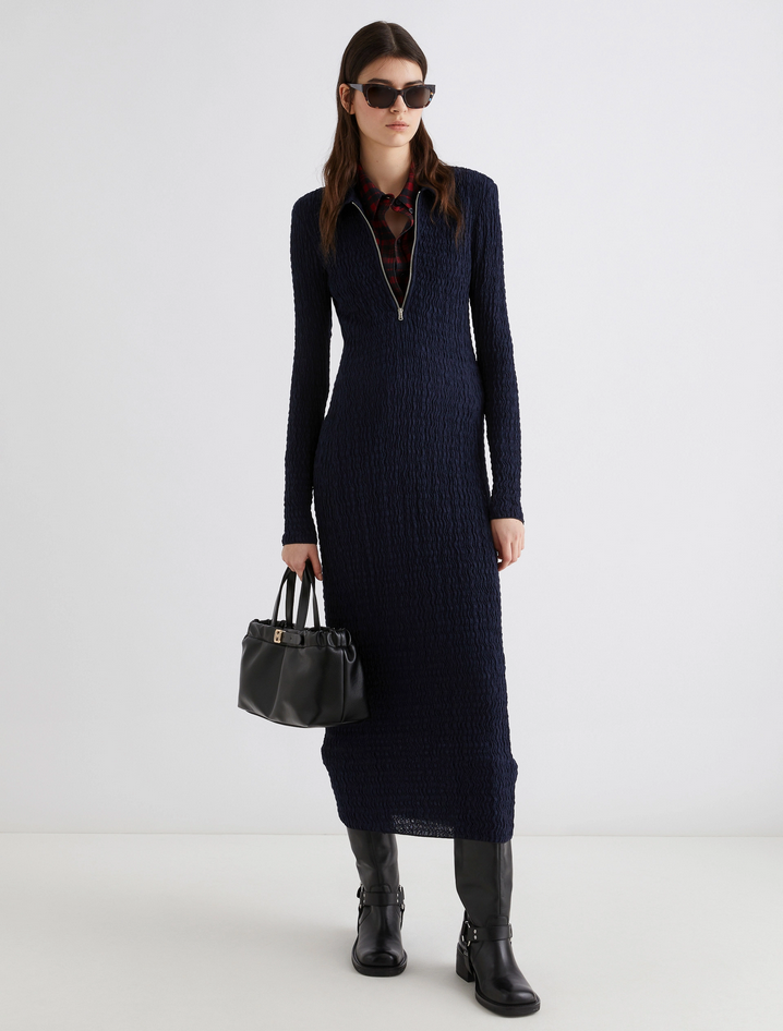 Scolpisci la tua silhouette con questo abito in jersey cloqué: la sensualità delle linee si abbina al tocco active della zip sullo scollo, da aprire a piacere. Abito lungo in jersey di misto cotone cloqué, fit aderente, scollo a polo con zip metallica, polsi e fondo capo con filo elastico, capo foderato. Composizione: tessuto a maglia 53% cotone, 46% poliammide, 1% elastan; fodera 100% poliammide. Lavaggio: lavare a mano in acqua fredda max 40°, non candeggiare, non asciugare in tamburo, asciugare in piano all'ombra, ferro tiepido max 120 gradi C, lavare a secco delicato con percloroetilene, non lavare ad umido professionalmente, usare un panno tra capo e ferro, stirare alla dimensione originaria, stirare usando solo vapore, usare detersivo neutro, non strofinare. Codiceprodotto EDDA 2523626014270003 A25