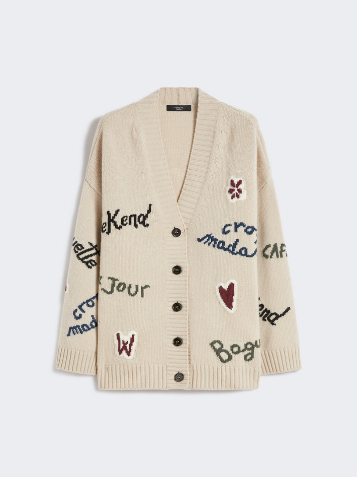 Cardigan overfit in filato di pura lana, impreziosito da lavorazione a intarsio con disegni sul davanti e sulle maniche, scollo a V, maniche lunghe a giro basso, chiusura frontale con bottoni, bordi rifiniti a coste. Composizione: 100% lana vergine. Lavaggio: a mano in acqua fredda max 40°, non candeggiare, non asciugare in tamburo, asciugare in piano all'ombra, ferro tiepido max 120°, lavare a secco delicato con percloroetilene, non lavare ad umido professionale, usare un panno tra capo e ferro, usare detersivo neutro. Codice prodotto BELGIO 2525346082650005 A25
