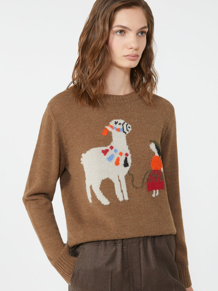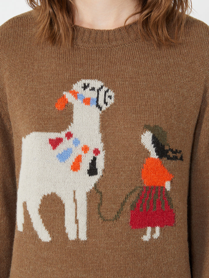 Maglia girocollo in filato di alpaca e lana, personalizzata con motivo intarsiato al centro sul davanti. Volume e lunghezza regolari, maniche lunghe a giro e bordi rifiniti a coste. Composizione: 45% acrilica, 40% alpaca, 15% lana. Lavare a mano in acqua fredda max 40°, non candeggiare, non asciugare in tamburo, asciugare in piano all'ombra, stirare a ferro tiepido max 120°C, lavare a secco delicato con percloroetilene, non lavare ad umido professionale, usare un panno tra capo e ferro, usare detersivo neutro. Codice prodotto NITRA 2525366292650005 A25