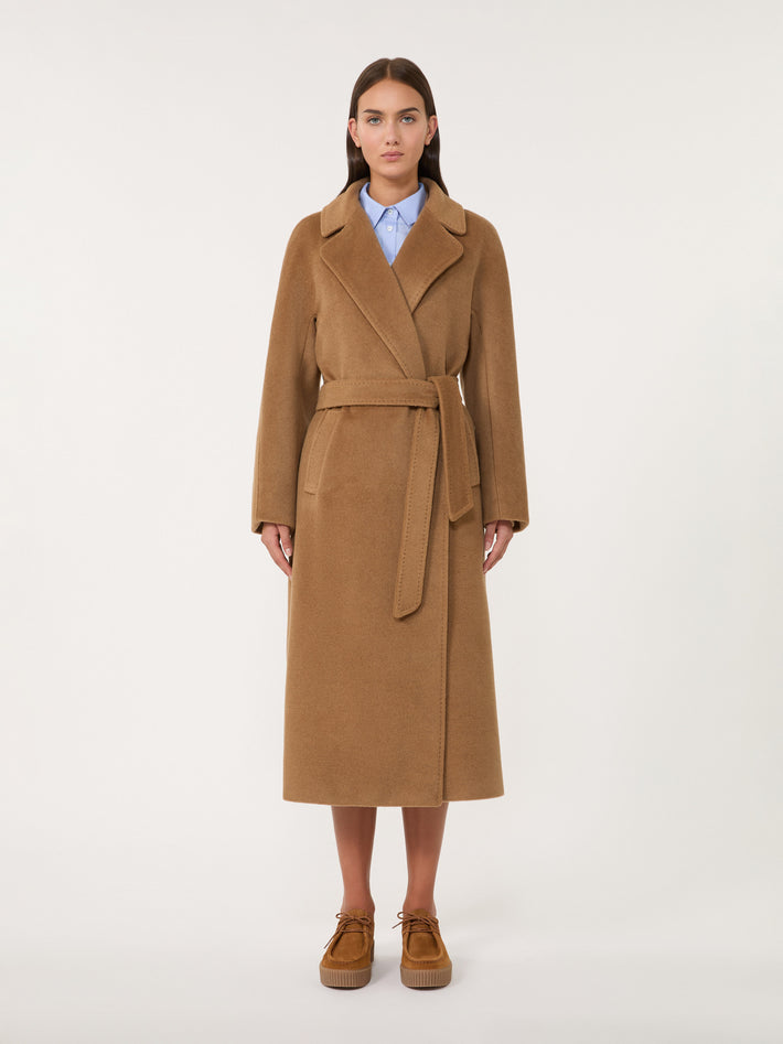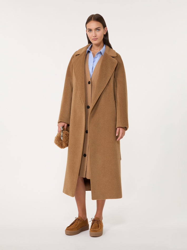 Cappotto lungo dalla silhouette a vestaglia con cintura abbinata in vita, realizzato in tessuto misto lana e alpaca. Linea svasata, collo a rever ampio, maniche lunghe a kimono, tasche a filettone sui fianchi, spacco centrale sul retro e interno foderato. Composizione: 48% lana, 22% alpaca, 15% poliammide, 15% mohair; fodera 50% acetato, 50% viscosa. Cura del capo: non lavare in acqua; non candeggiare; non asciugare in tamburo; ferro tiepido max 120 °C; lavare a secco delicato con percloroetilene; non lavare ad umido professionale. Codice prodotto TEMPERA 2525016082650026 A25