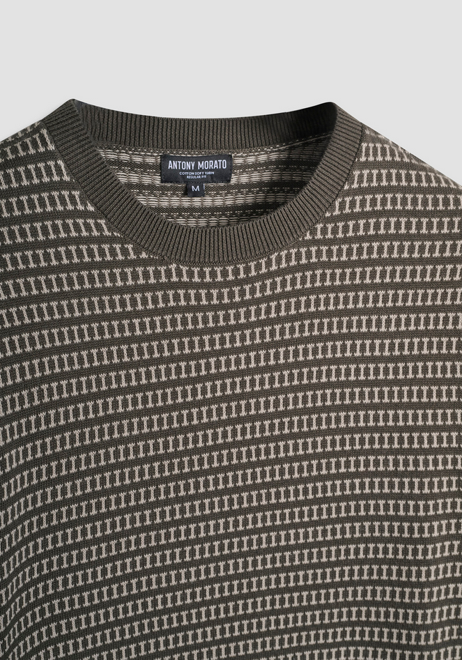 Maglia girocollo regular fit realizzata in morbido e corposo filato di cotone, caratterizzata da un raffinato motivo jacquard geometrico a contrasto colore. Polsini, fondo e colletto in maglia a costine, con piccola placchetta metallica logata cucita sul retro. Un capo dalla linea moderna e versatile, perfetto per aggiungere un tocco ricercato anche ai look casual. Composizione: 100% cotone. Lavaggio: in lavatrice max 30°; non candeggiare; asciugare in piano; stirare max a 110°; non lavare a secco. Codice prodotto MMSW01527-YA1000644089 A25