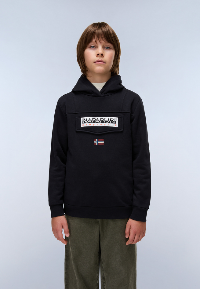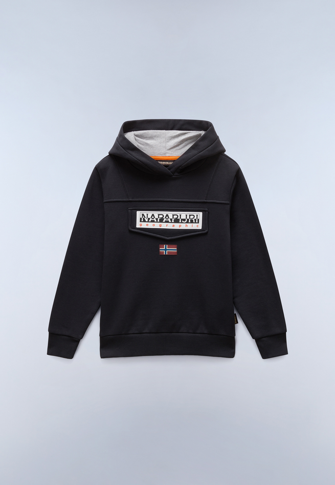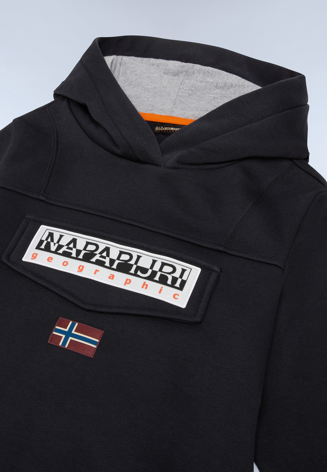 Felpa da bambino Burgee in 90% cotone, 10% poliestere, cappuccio ampio e sottogola per maggiore comfort, grafica Napapijri e stemmi. Stirare a freddo, asciugare in asciugatrice a bassa temperatura, lavare in lavatrice in acqua fredda, ciclo delicato. Codice prodotto NP0A4I6T041 A25