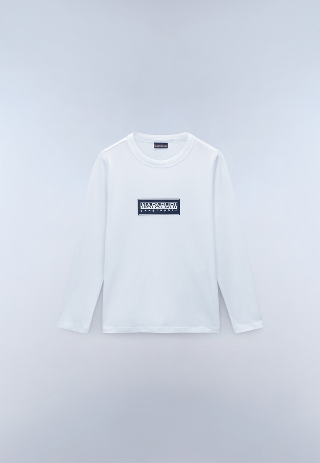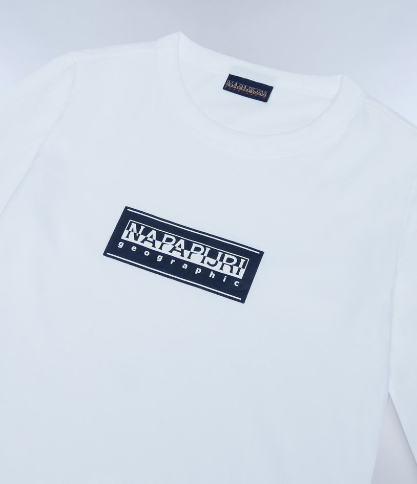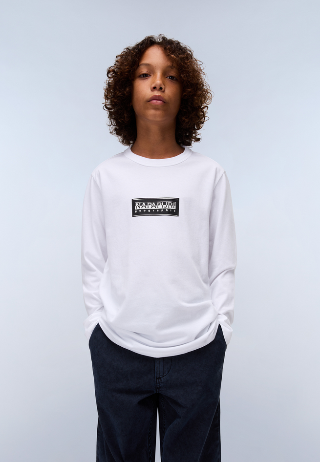T-shirt da bambino Chamois in 100% cotone, girocollo, maniche lunghe e grafica Napapijri Geographic sul petto. Dettagli stampati. Non asciugare in asciugatrice, lavare in lavatrice in acqua fredda, stirare a caldo. Codice prodotto NP0A4HYK002 A25