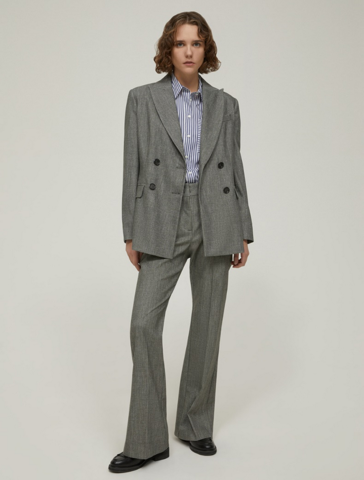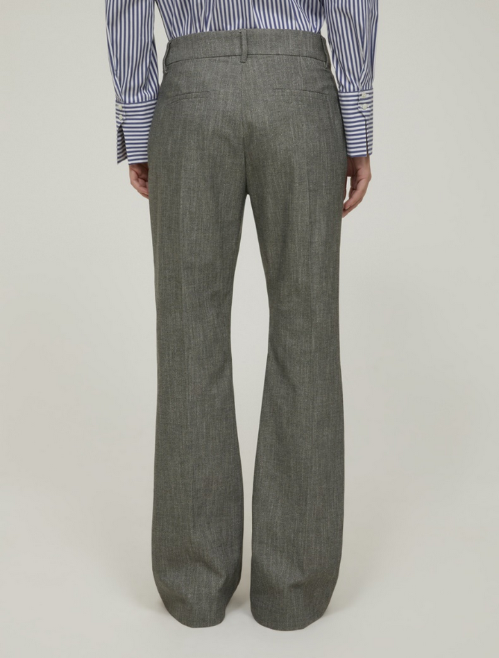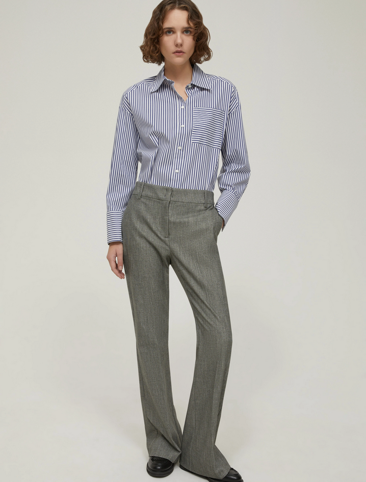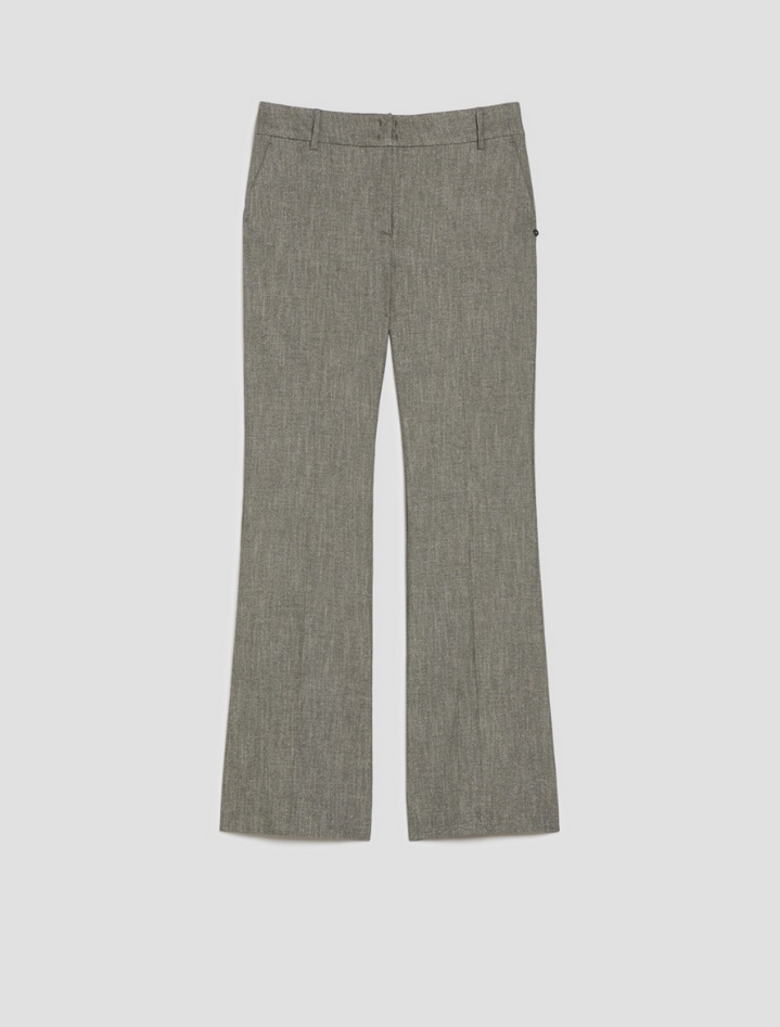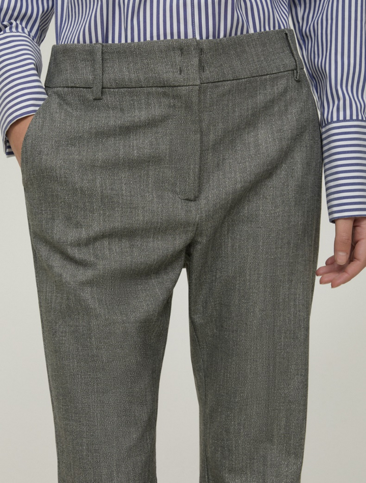 Pantaloni sartoriali in twill di cotone stretch con lurex, caratterizzati da un sottile filo di lamé che illumina il tessuto con delicati riflessi metallici, aggiungendo un tocco di glamour al look. Presentano gamba slim fino al ginocchio leggermente svasata al fondo, vita regolare con passanti, piega stirata, tasche alla francese sul davanti e a filo sul retro. La chiusura è nascosta con ganci e zip. Perfetti abbinati al blazer coordinato della collezione per un ensemble elegante e moderno. Composizione: 51% cotone, 21% viscosa, 20% poliestere, 3% poliammide, 3% fibra metallizzata, 2% elastan. Lavaggio: lavare a mano in acqua fredda max 40°; non candeggiare; non asciugare in tamburo; asciugare appeso in ombra; ferro tiepido max 120°; lavare a secco delicato con percloroetilene; non lavare ad umido professionale; non lasciare in ammollo. Codice prodotto MACRO 2521136293200004 A25