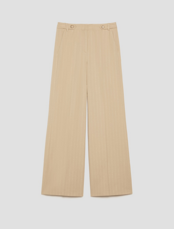 Con delicati bagliori di lamé, i pantaloni gessati rileggono i classici sartoriali maschili all'insegna di una moderna femminilità, gabardine in cotone e viscosa, disegno gessato in lurex, gamba ampia e diritta, vita regolare con cinturini e passanti, tasche alla francese sul davanti, piega stirata, chiusura nascosta con ganci e zip, blazer coordinato in collezione. Composizione e lavaggio: 55% viscosa, 43% cotone, 1% fibra metallizzata, 1% altre fibre. Lavare a mano acqua fredda max 40°, non candeggiare, non asciugare in tamburo, asciugare appeso in ombra, ferro tiepido max 120 gradi C, lavare a secco delicato con percloroetilene, non lavare ad umido professionale, non lasciare in ammollo. Codice prodotto UNGARO 2521136017200001 A25