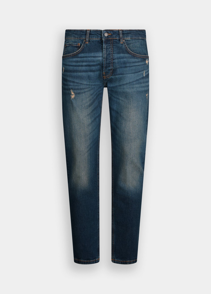 Jeans tapered in denim di cotone stretch con lavaggio used e dettagli destroyed, vita regolare, modello cinque tasche, salpa logata e chiusura coperta con bottoni. Composizione: 99% cotone, 1% elastan. Codice prodotto QF5279 D025278958 A25