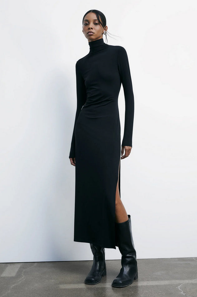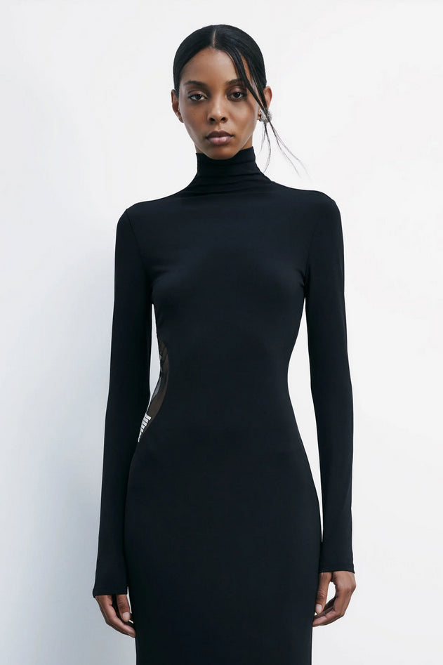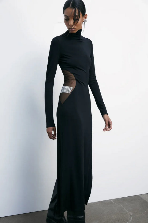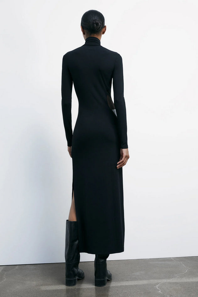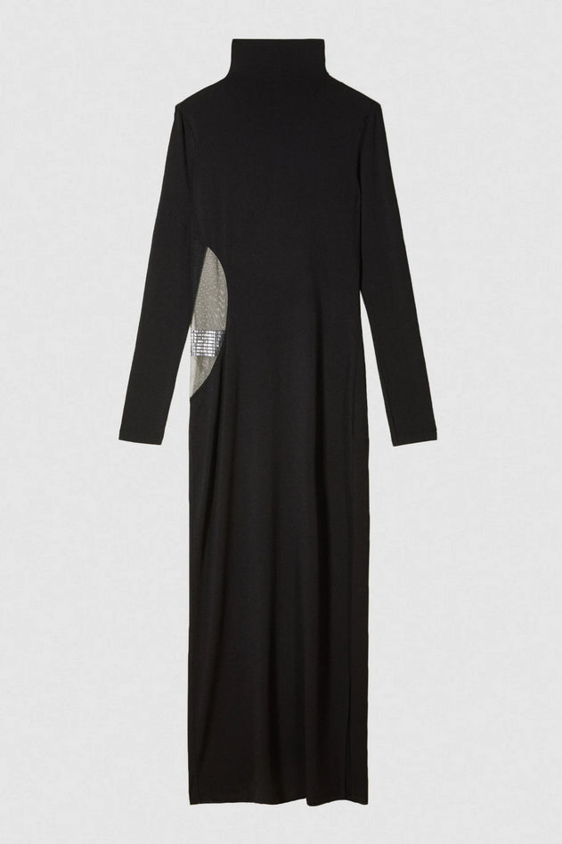 Abito lungo elasticizzato della capsule Clubbing di Patrizia Pepe, dal design aderente con collo alto. Il modello slim in jersey di poliestere stretch presenta un audace cut-out sul fianco destro con inserto in tulle, arricchito da strass a effetto gioiello, che dona un tocco sensuale e luminoso. Maniche lunghe, logo Patrizia Pepe ricamato sul retro del collo. Composizione: tessuto principale 92% poliestere, 8% elastan; prima applicazione 100% vetro; tessuto secondario 100% poliestere. Cura: lavare a mano seguendo le indicazioni sull'etichetta di manutenzione.Codice prodotto 2A2968-J338J4R0 A25