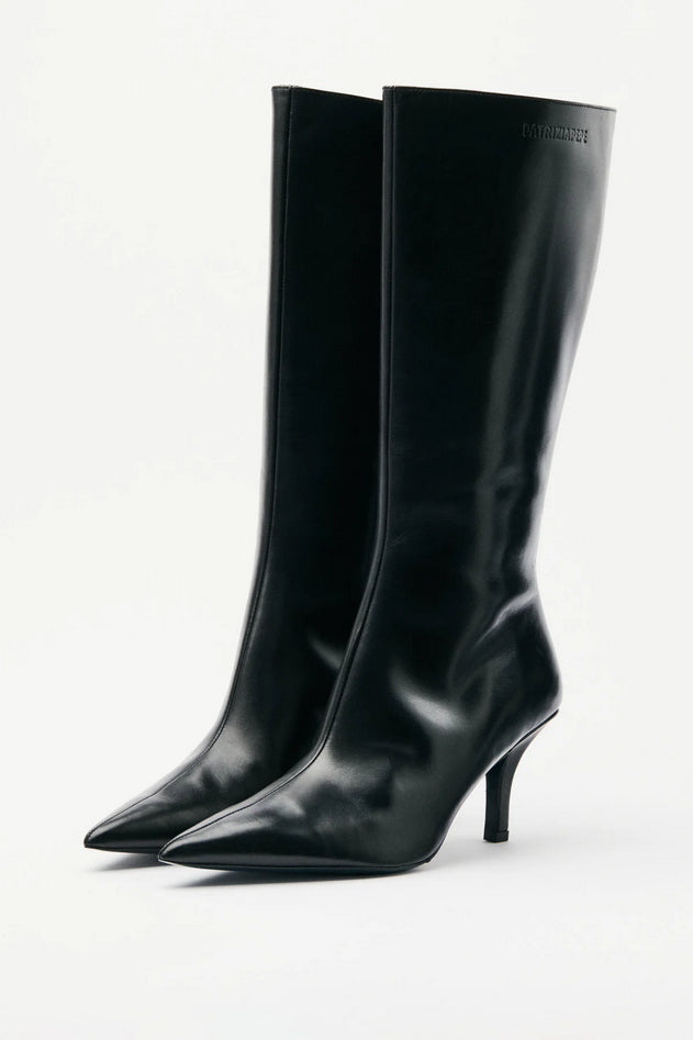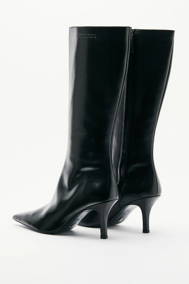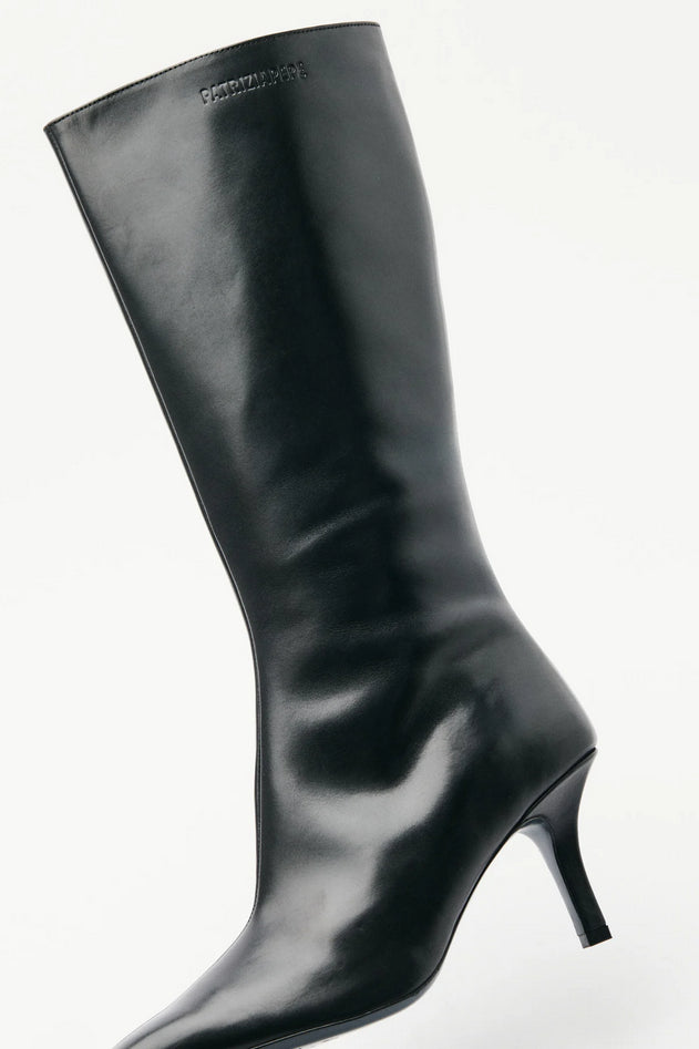 Stivali al polpaccio Minimal Shape in pelle di vitello liscia con design essenziale, lettering "Patrizia Pepe" in rilievo sul gambale, tirazip in pelle, tacco 7,5 cm, fodera in pelle, suola in cuoio verde con motivo Fly impresso e rivetto Fly 3D light gold. Composizione: pelle principale 100% vitello, fodera 100% pecora, suola 100% cuoio. Cura: evitare contatto con solventi, alcool e materiali abrasivi; pulire con spazzola specifica o panno morbido leggermente umido. Codice prodotto 8Y0131-L166K103 A25