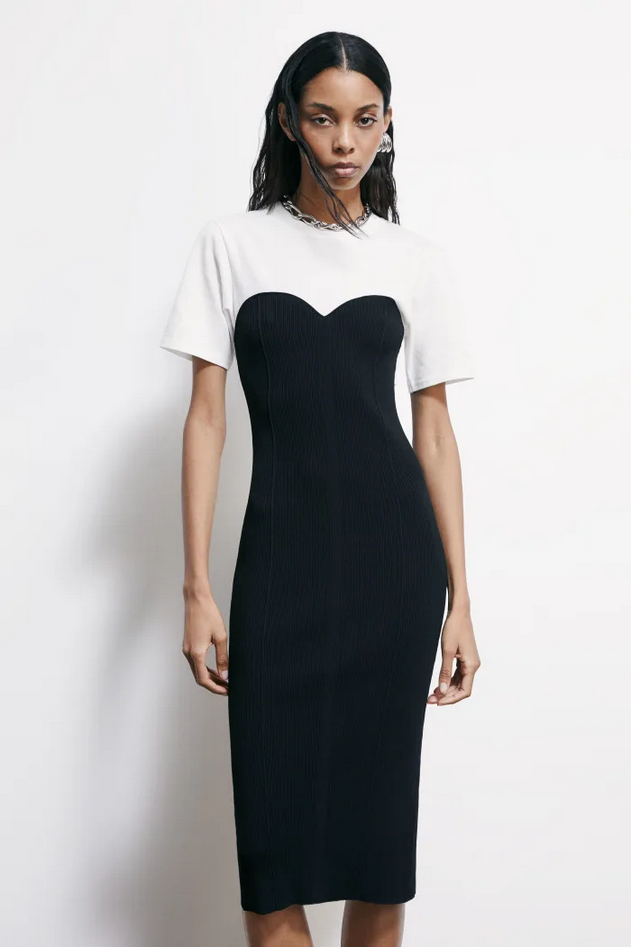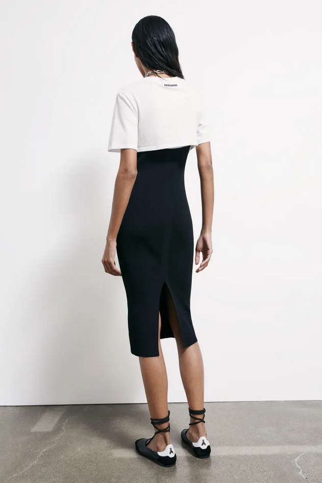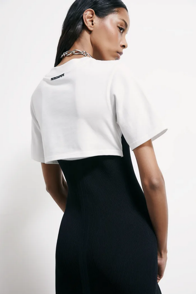 Questo abito midi interpreta il daywear contemporaneo attraverso un design ibrido che unisce un tubino aderente in maglia a costine a una T-shirt in jersey di cotone integrata. La struttura in misto fibre, composta al 75% da viscosa, 22% poliestere e 3% spandex, garantisce una vestibilità slim e flessibile sul corpo, mentre le maniche corte in 100% cotone offrono un contrasto morbido e volumi scivolati. Il dettaglio della T-shirt cucita sul fronte e libera sulla schiena crea un movimento fluido, completato dallo scollo a cuore e dal logo gommato sul retro per un'attitudine urbana e raffinata. Per mantenere la stabilità della maglia e la morbidezza delle diverse texture, il capo richiede il lavaggio a mano e l'osservanza delle istruzioni riportate nell'etichetta di manutenzione. Codice prodotto 8A1630-K081F2NS P26