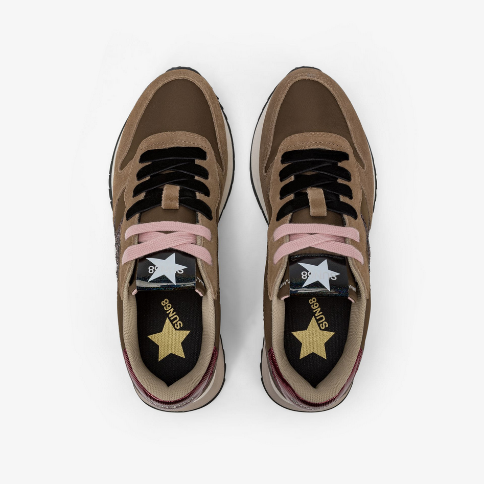 Sneaker Stargirl Glitter da donna in nylon e suede con dettaglio laminato, stile running innovativo, leggero ed estremamente femminile. La patch glitterata con logo ricamato sul lato illumina il design, mentre lo spoiler posteriore è rifinito con materiale effetto snake. Etichetta logata con stella sulla linguetta, chiusura con lacci in velluto, fodera in micro mesh e suola in EVA fresata con battistrada in gomma. Composizione: 49% pelle, 41% residui tessili o composizione non determinata, 10% poliuretanica. Codice prodotto Z4521708 A25