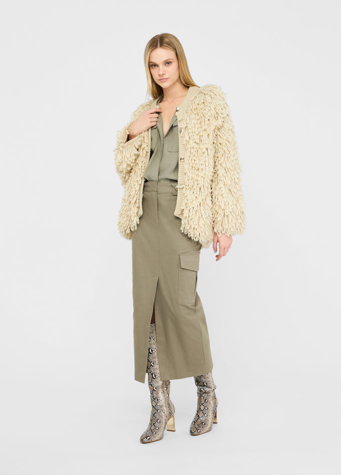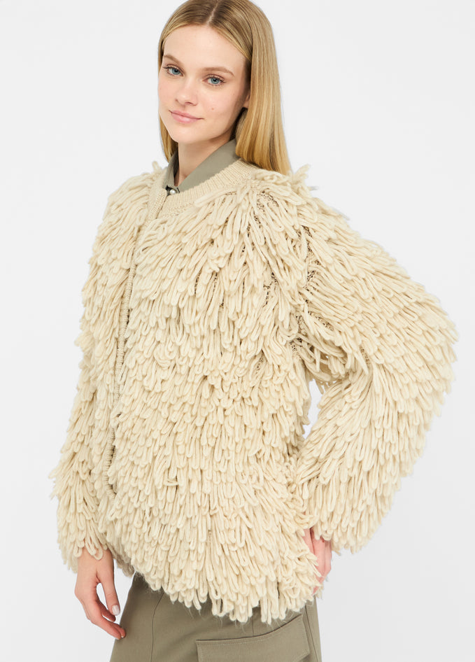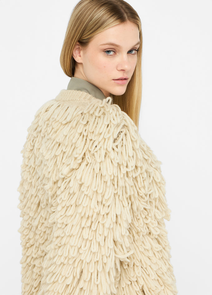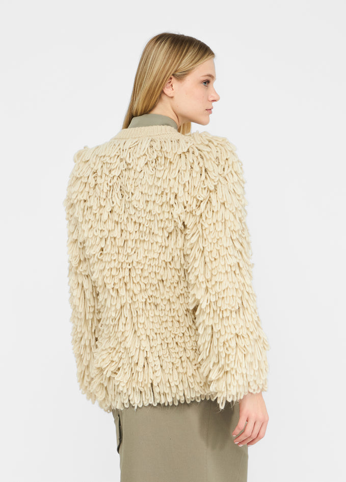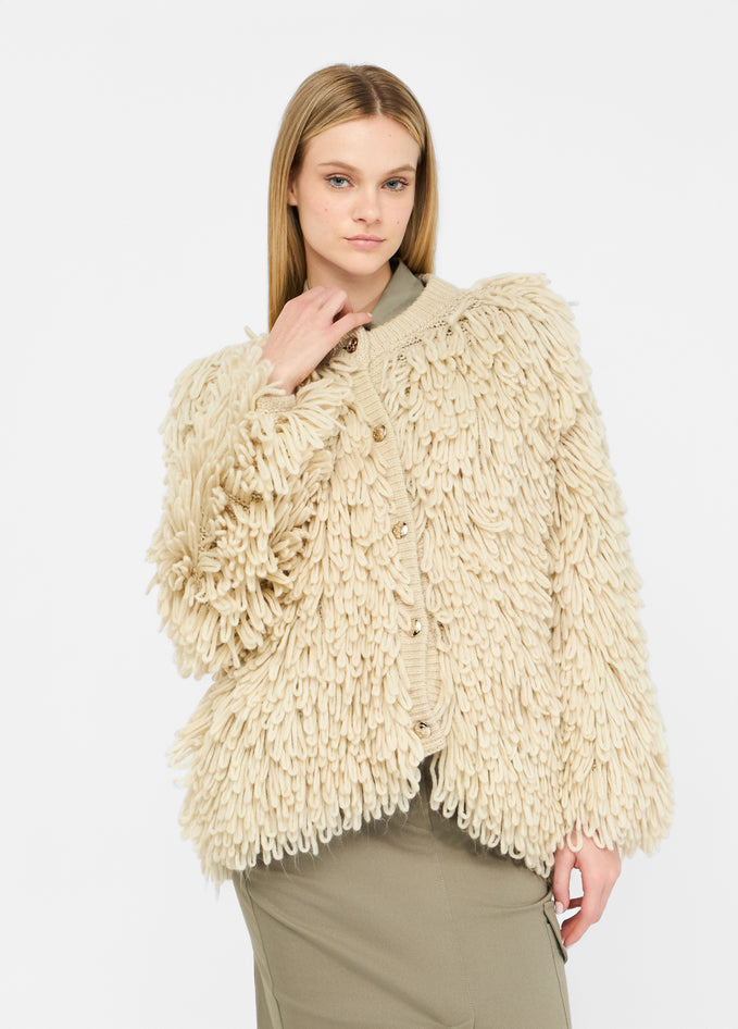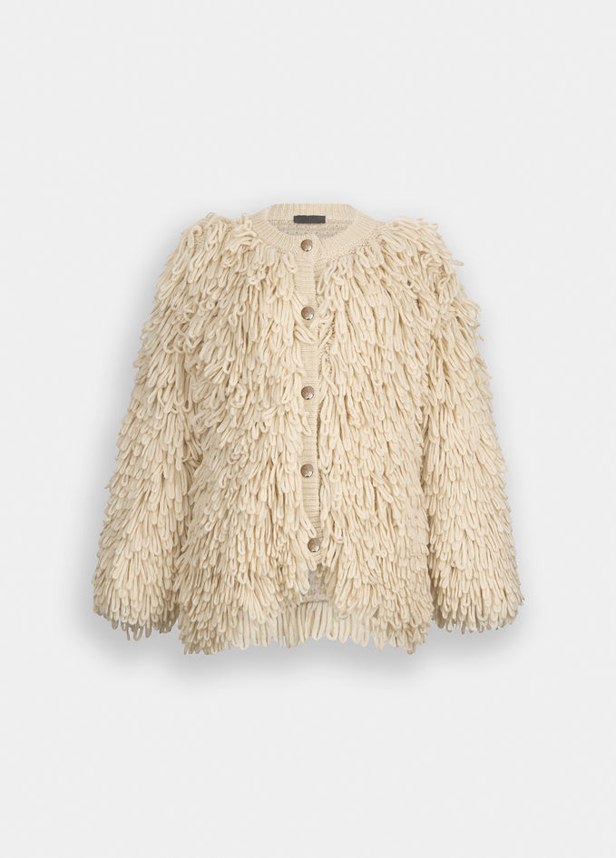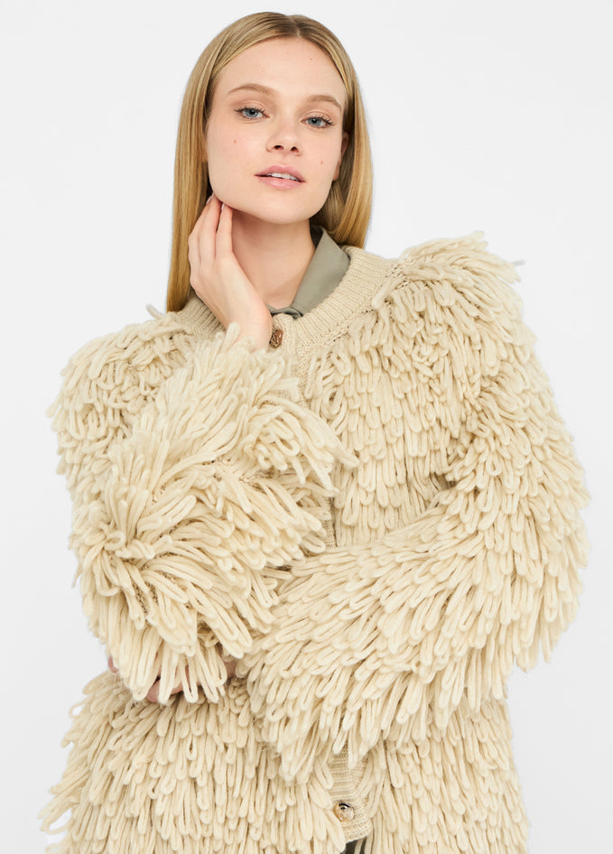 Giaccone in maglia di misto lana con lavorazione punto pelliccia che dona una texture voluminosa e morbida al tatto, scollo rotondo e chiusura con bottoni logati. Composizione: tessuto principale 52% poliammide, 34% acrilica, 14% lana; tessuto secondario 70% acrilica, 15% poliammide, 15% lana. Lavaggio: lavare delicatamente max 30°C, non trattare con cloro, lavare delicatamente a secco con tetracloroetilene, lavare in centri specializzati, lavare a rovescio. Asciugatura: non usare asciugatrice, asciugare in piano, rimettere in forma dopo il lavaggio. Stiraggio: stirare a temperatura massima 110°C, stirare solo con vapore. Codice prodotto CF5314 MA88QX0715 A25