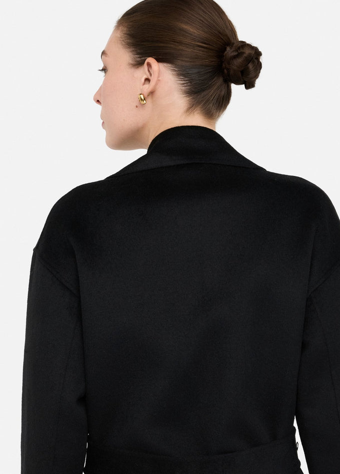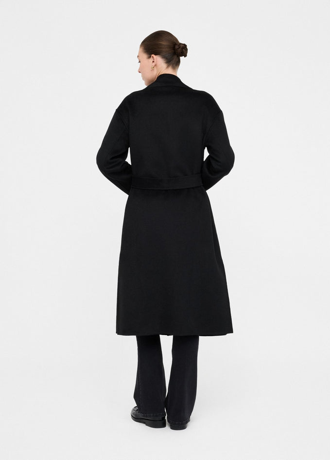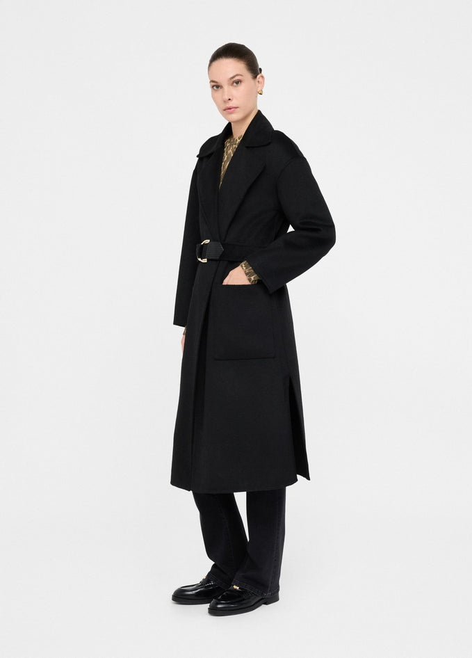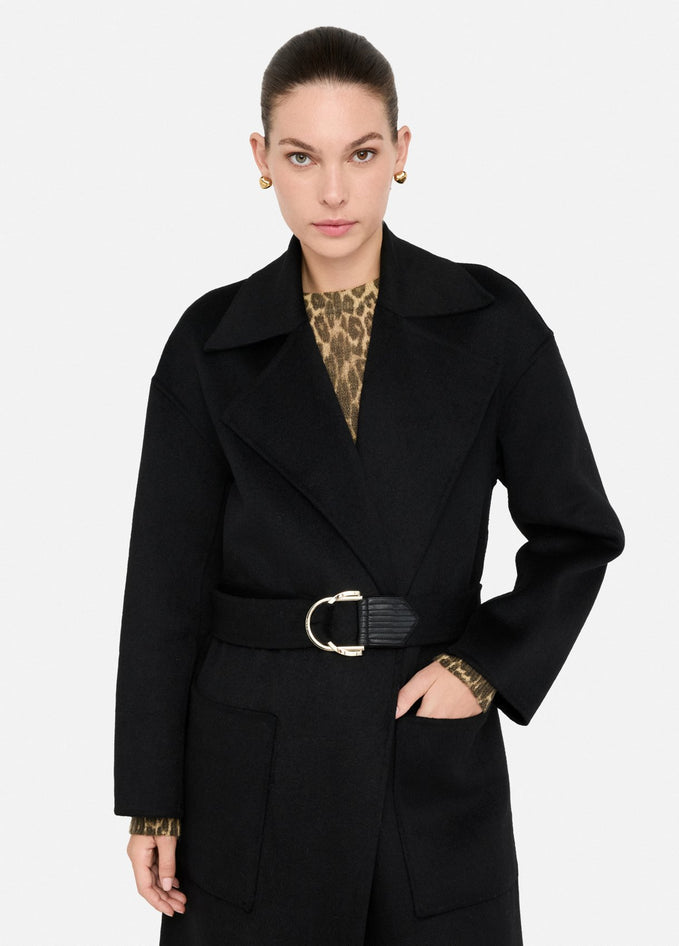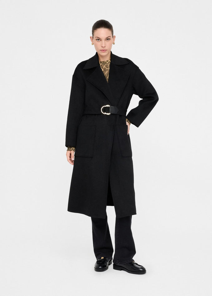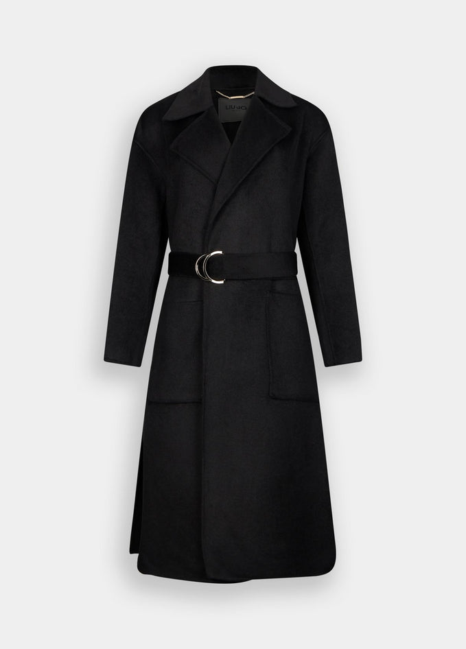 Cappotto nero realizzato in panno di misto lana con collo a revers, tasche sui lati, spacchi laterali, cintura sur ton con fibbia d-ring in abbinamento e chiusura doppiopetto. Composizione: tessuto principale 50% poliestere, 50% lana, spalmatura 100% resina poliuretanica, tessuto secondario 100% poliestere. Lavaggio: non lavare in acqua, non trattare con cloro, lavare delicatamente a secco con tetracloroetilene. Asciugatura: non usare asciugatrice. Stiraggio: non stirare, stirare a temperatura massima 110 °C, non stirare le decorazioni, stirare interponendo un panno. Codice prodotto CF5283 T462722222 A25
