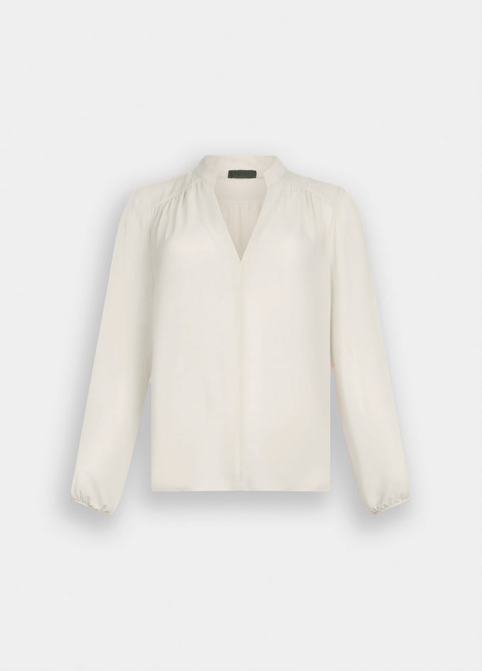 Blusa avorio in georgette con collo alla coreana e motivo a V, maniche lunghe e polsi con elastico. Prodotto "Liu Jo Better". Composizione: tessuto principale 100% poliestere. Lavaggio: lavare a mano, non trattare con cloro, lavare delicatamente a secco con tetracloroetilene, lavare a rovescio. Asciugatura: non usare asciugatrice. Stiraggio: non stirare, stirare a temperatura massima 110°C, non stirare le decorazioni. Codice prodotto CF5413 TS869X0726 A25